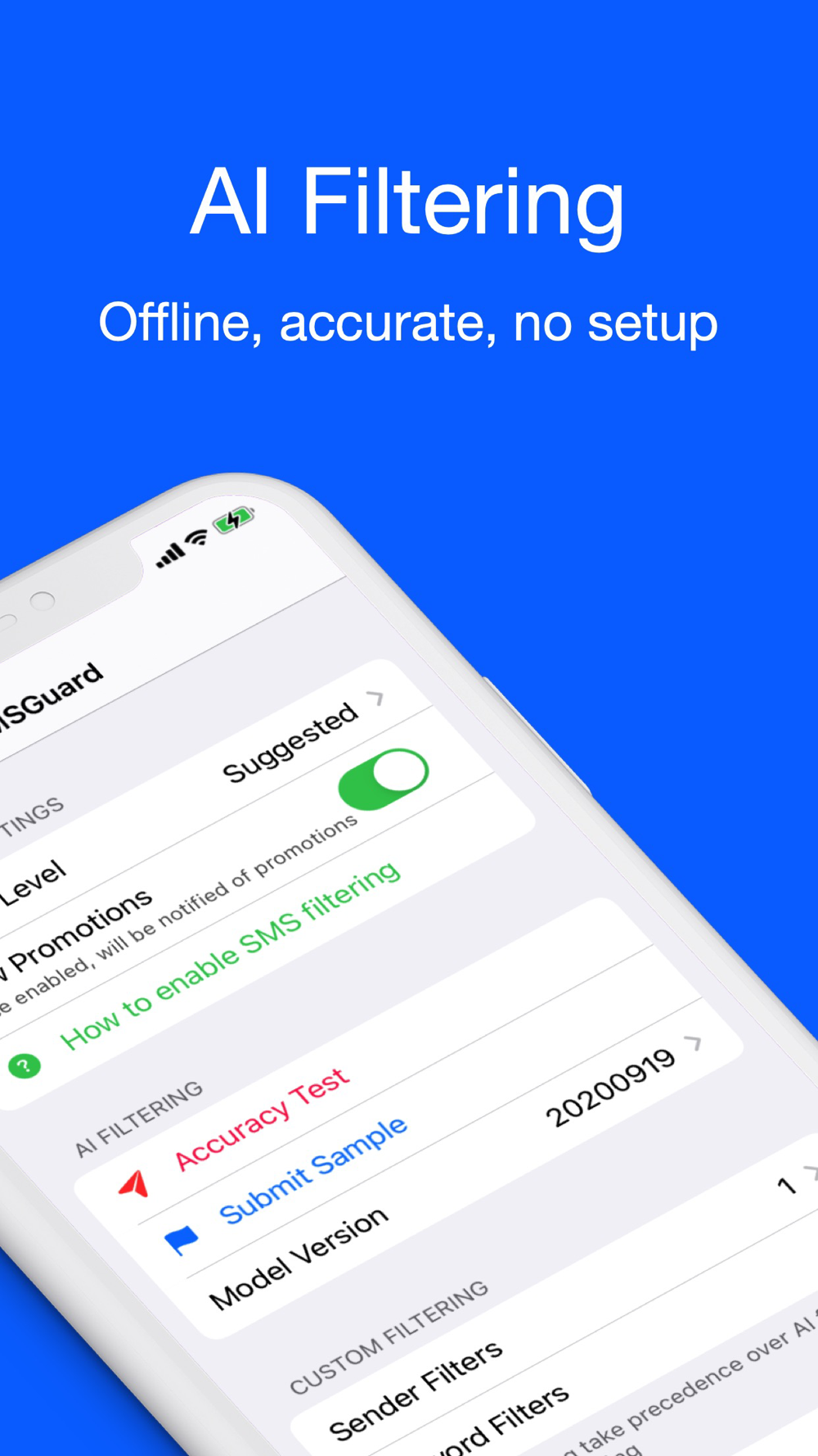 SMSGuard is a message filter based on the latest AI technology, trained on thousands of sample messages, and is constantly learning and updating from user-submitted samples.