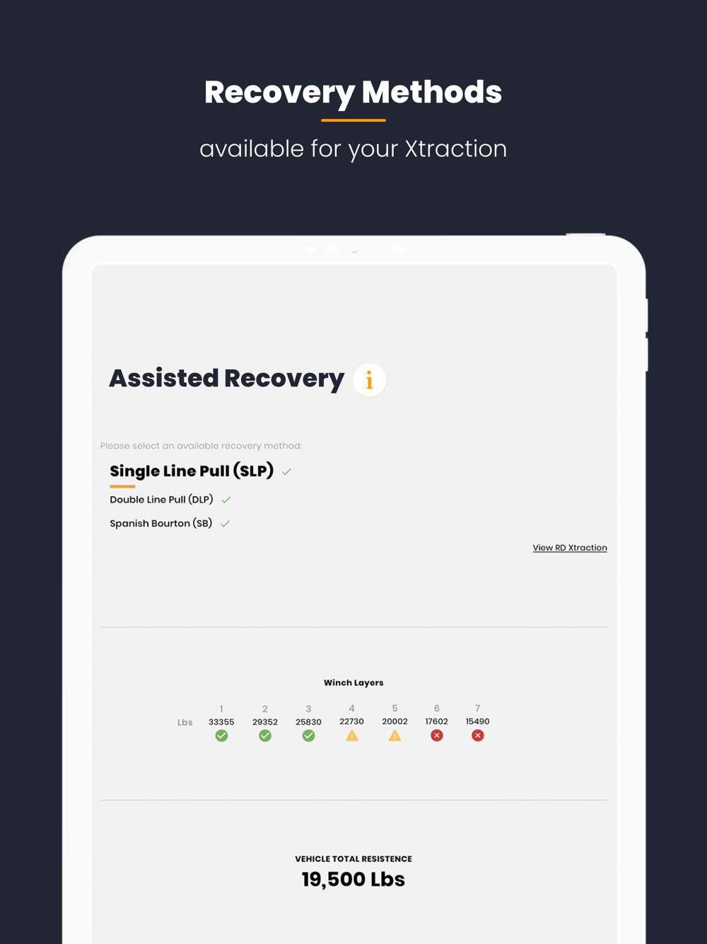 This app will ask for a few data inputs such as vehicle weight, gradient, ground condition, stuck wheels, and winch capacity - and then provide you with the Total Resistance (or Load) required in order to Xtract the stuck vehicle using either self-recovery and/or assisted recovery methods.