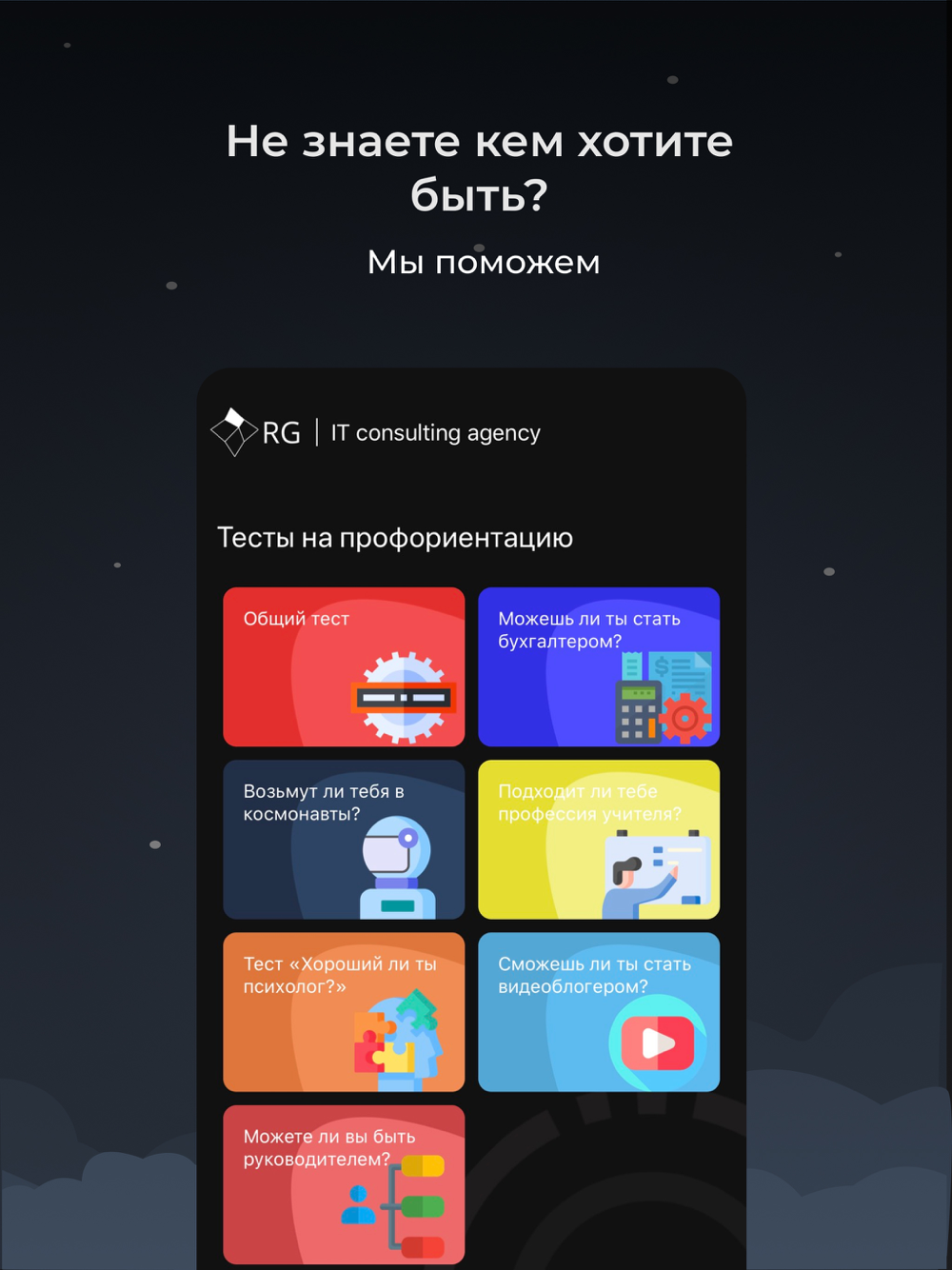 Если вы относитесь к людям, которые еще не определились с выбором, то мы хотим помочь вам сделать это. В разделе общего тестирования мы добавили для вас множество тестов на профориентацию.