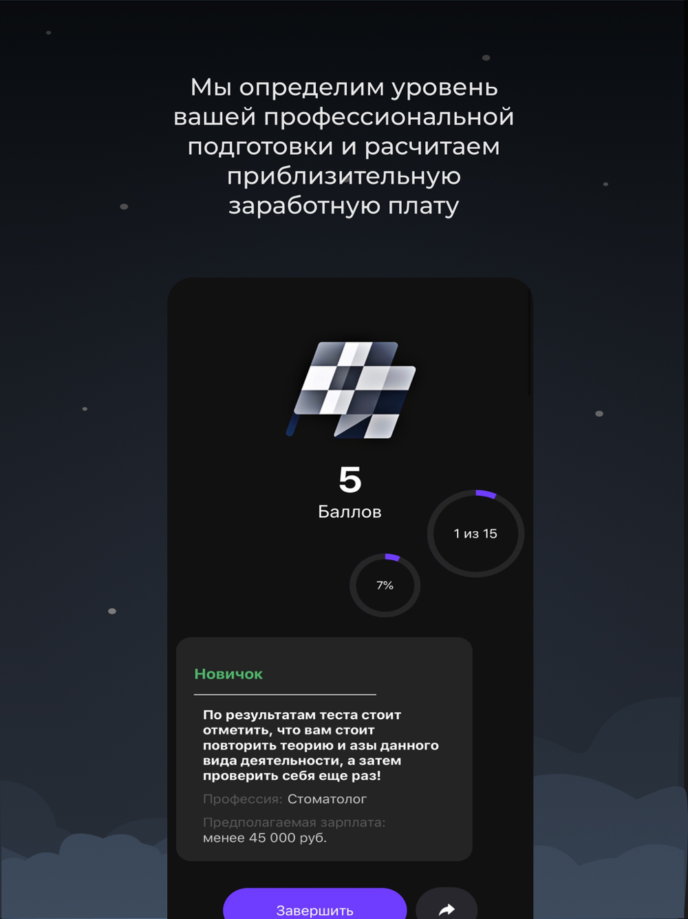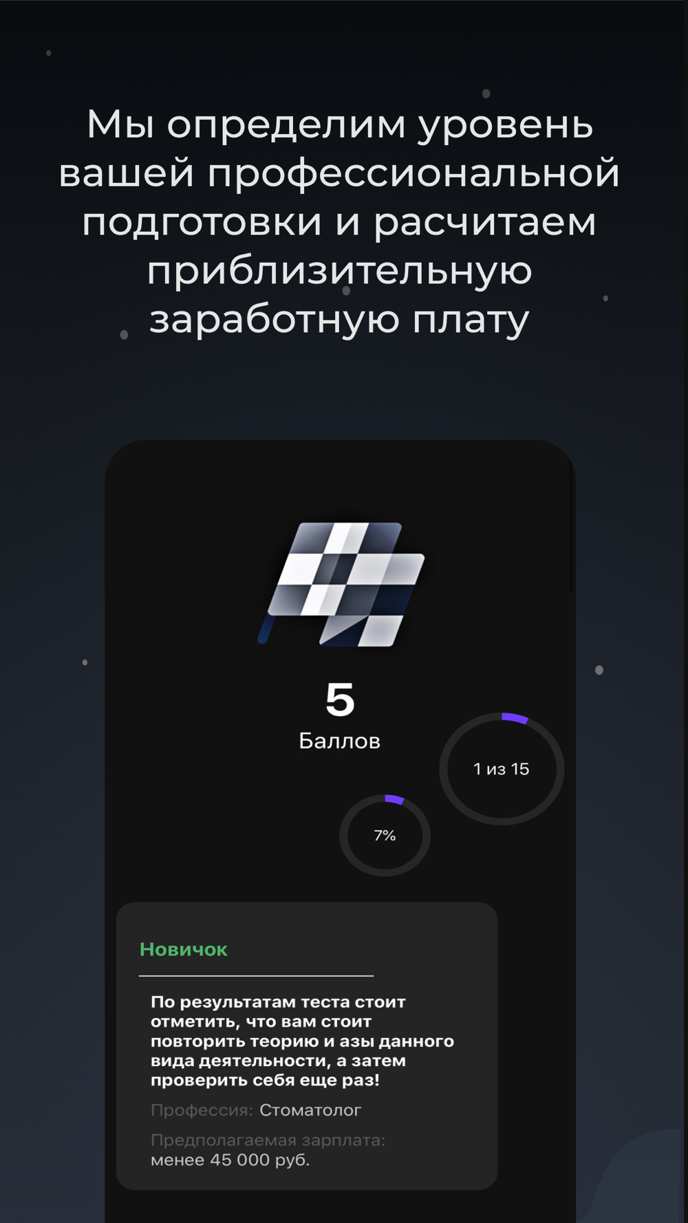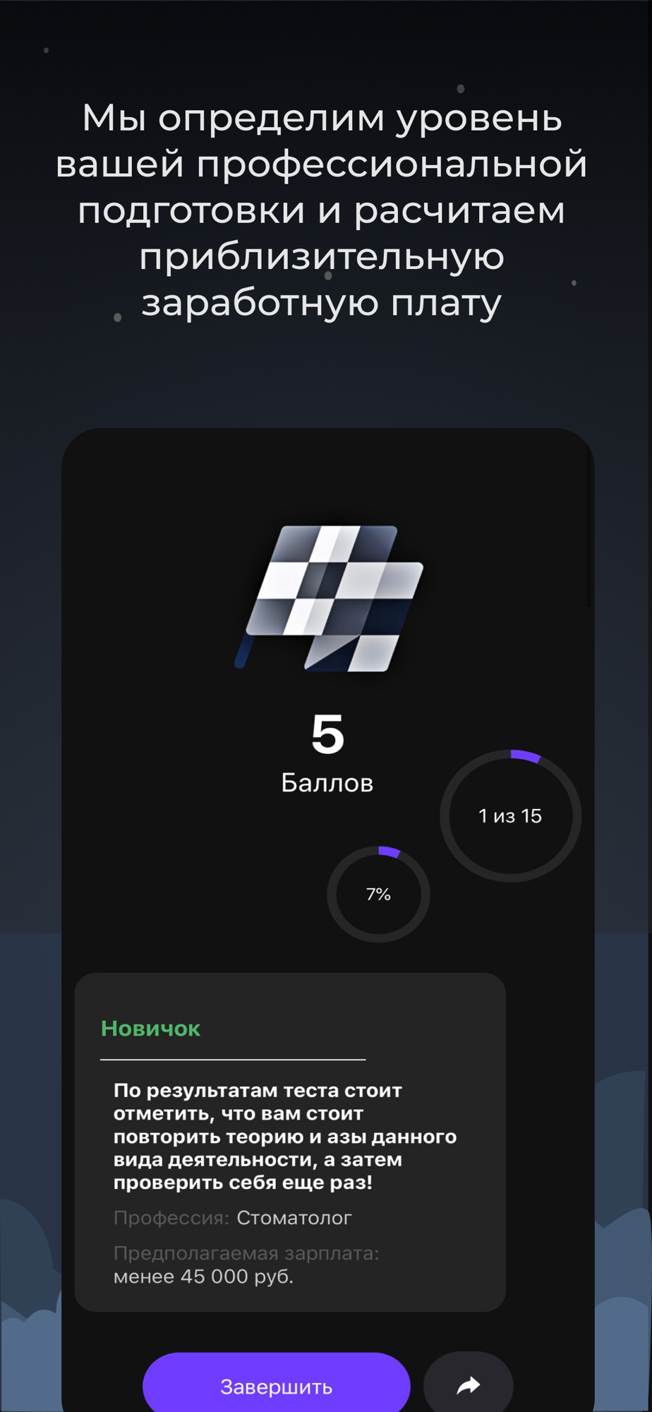В первом случае мы представляем вам широкий диапазон различных профессий где специалисты своего дела составили вопросы для вас на проверку определенных навыков. В конце опроса вам отобразятся результаты тестирования вместе с расчетом предполагаемой заработной платой.