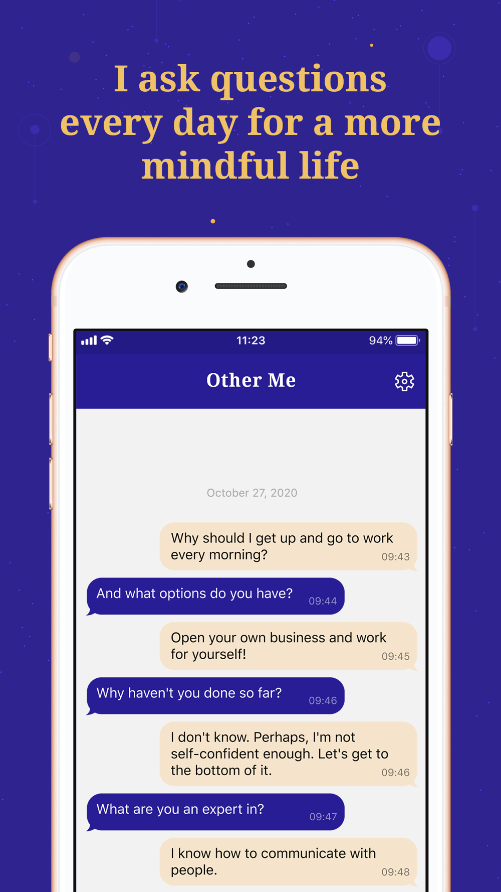 This is a new form of a personal diary. You keep it for yourself, you discuss it with yourself. This is a universal diary - you can add automatic questions from your other self, change them, schedule them to send, make a series of questions or remove altogether. Start your personal diary, and it'll make you stronger!