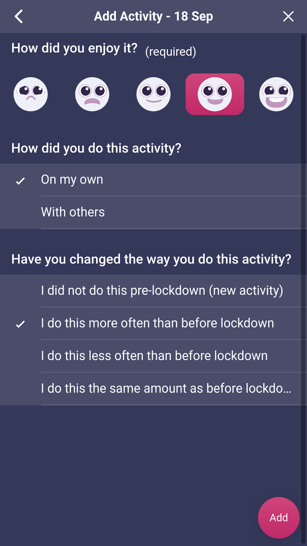 Our App is here to understand the impact of the pandemic on people’s lifestyles and help motivate and inspire you to stay active, creative and positive while journaling your daily activities. Journaling during a crisis is great for your mental wellbeing and can enable you to keep track of the days during local lockdowns and social distancing measures!