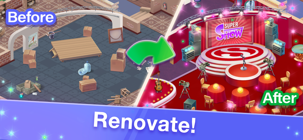 Film the most popular TV shows in your own studio! Design film sets, solve mind-blowing match-3 puzzles to get all the decoration you need to set up your studios and manage the most successful TV projects loved by millions of viewers!