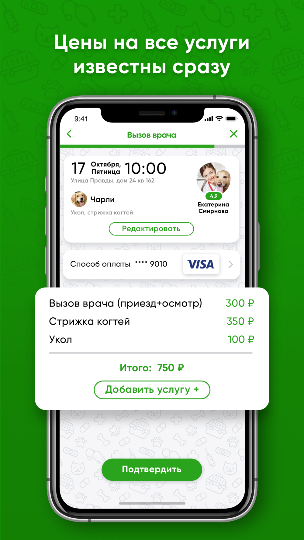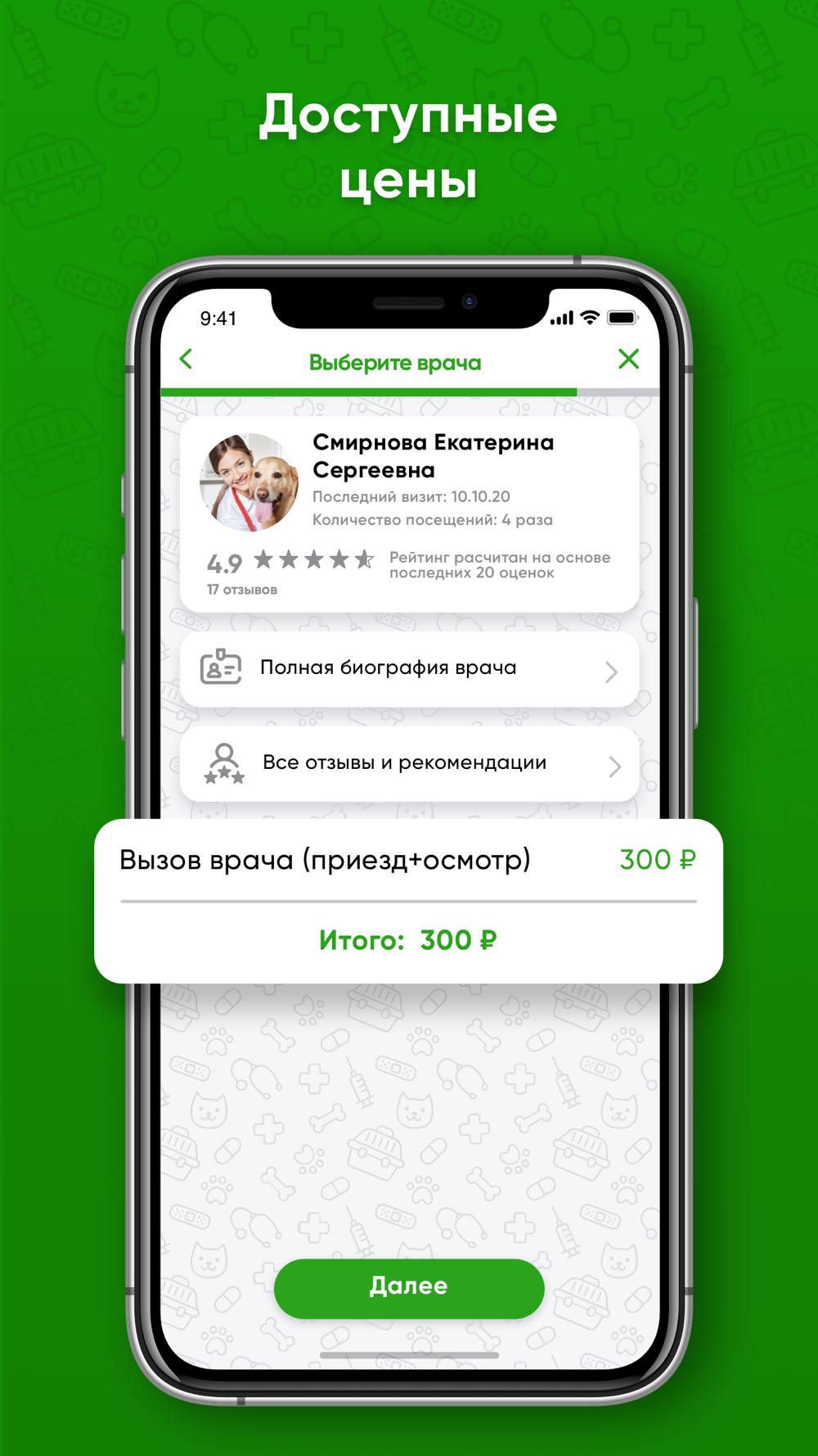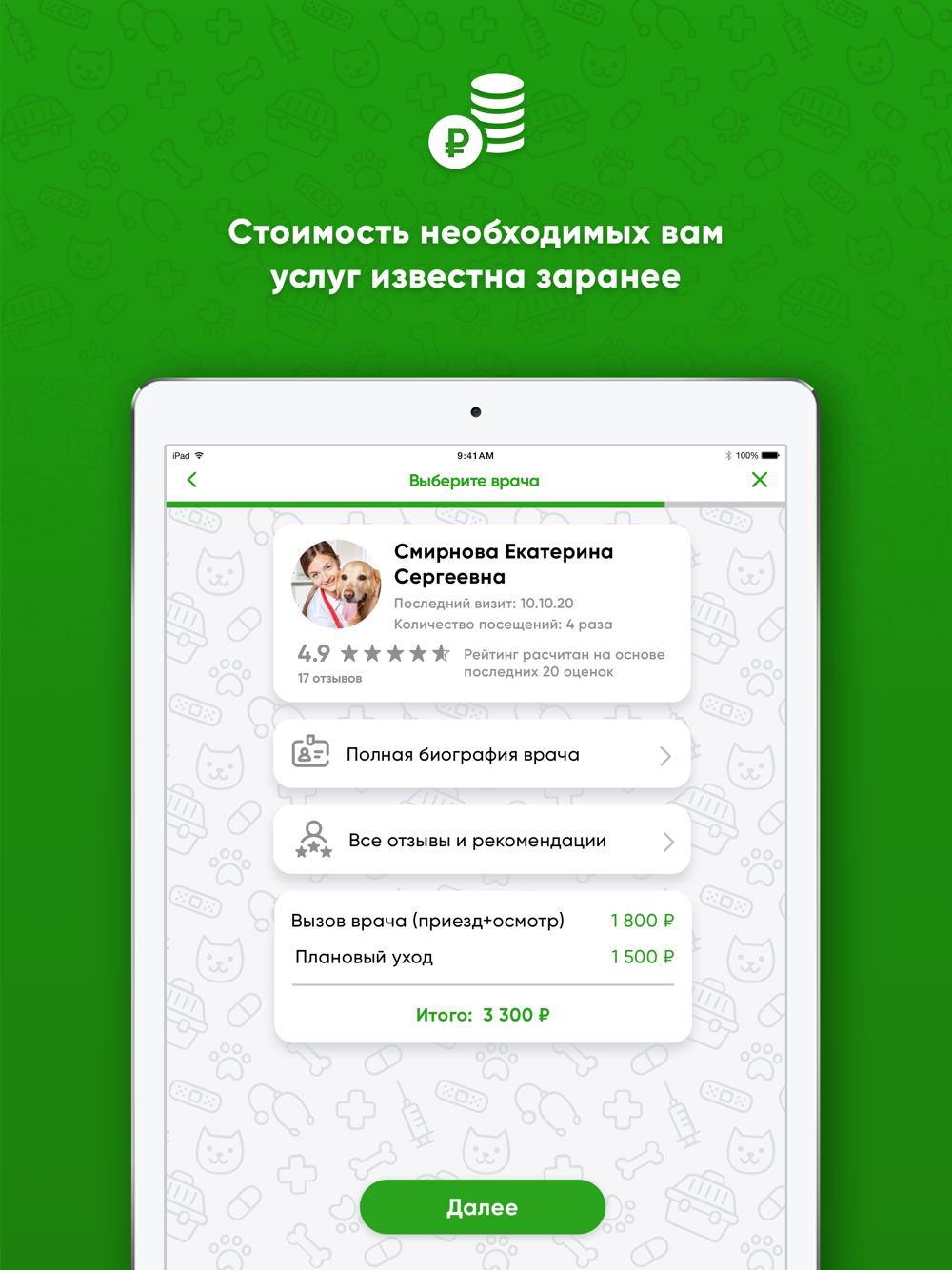 В приложении действуют комплексные программы, мы постоянно вводим новые услуги, например, приезд и первичный осмотр врача на дому по от 380 рублей - ведь ветеринарная медицина должна быть доступной!