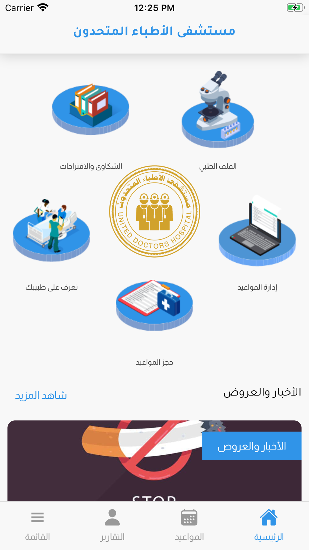 تطبيق مستشفى الأطباء المتحدون ( UDH Smart ) يوفر حزمة واسعة من الخدمات المختلفة مثل حجز المواعيد لدى العيادات والأطباء ، الاطلاع على التحاليل وتقارير الأشعة وإدارة المواعيد.