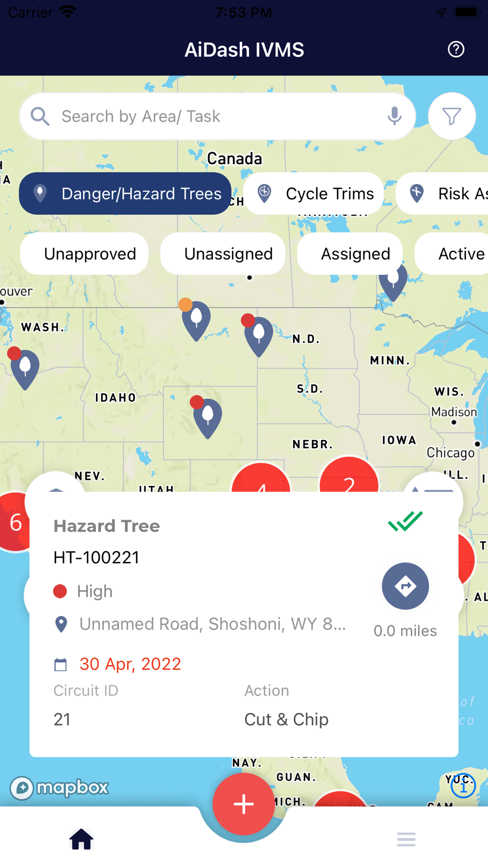 AiDash’s Intelligent Vegetation Management System (IVMS) is built for ground personnel and their managers to identify, log, plan and execute work on vegetation risks around assets. Work for all vegetation risks such as danger trees, hazard trees, tree trims, vine trims, herbicide and TGR application can be organized into work orders, prioritized and carried out with IVMS.