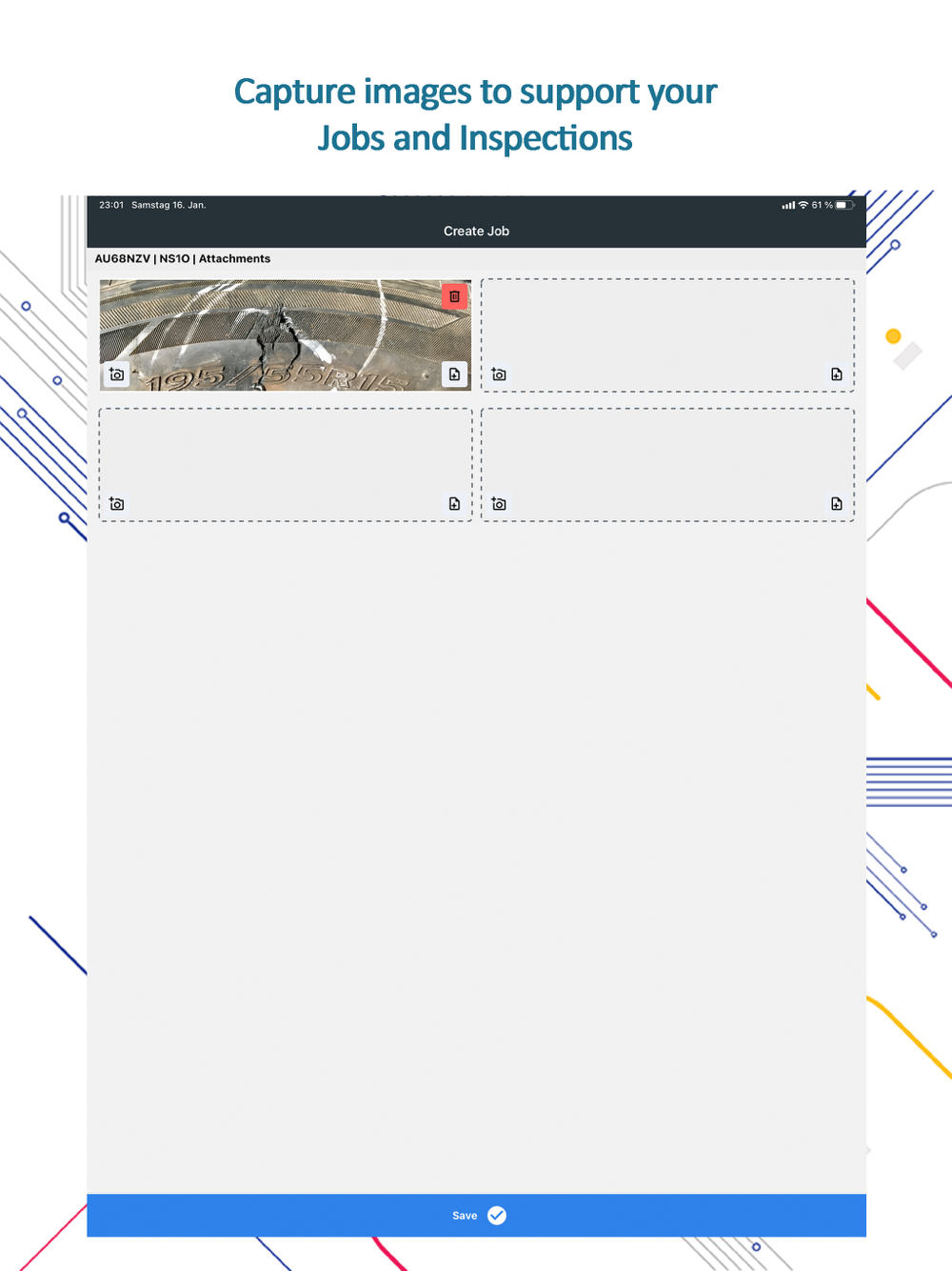 • Capture photos during work or inspections and attach it to job sheets and inspection reports