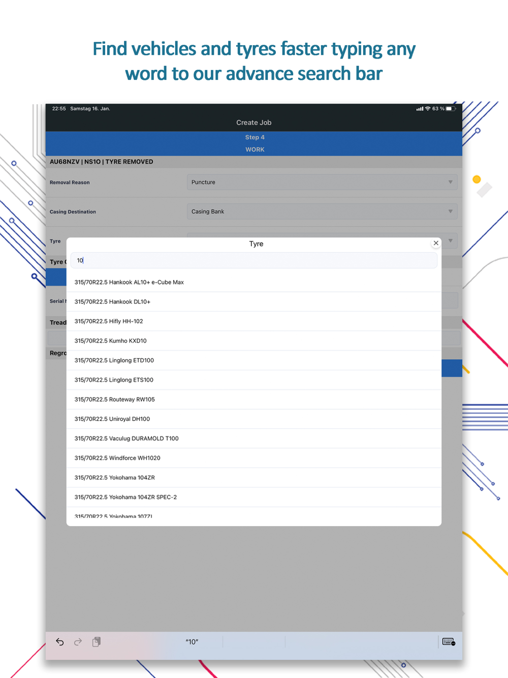 • Receive, complete, create and send jobs for service work, breakdowns or supply only, either for your own customers or other tyre businesses, sending job information straight into their operating system