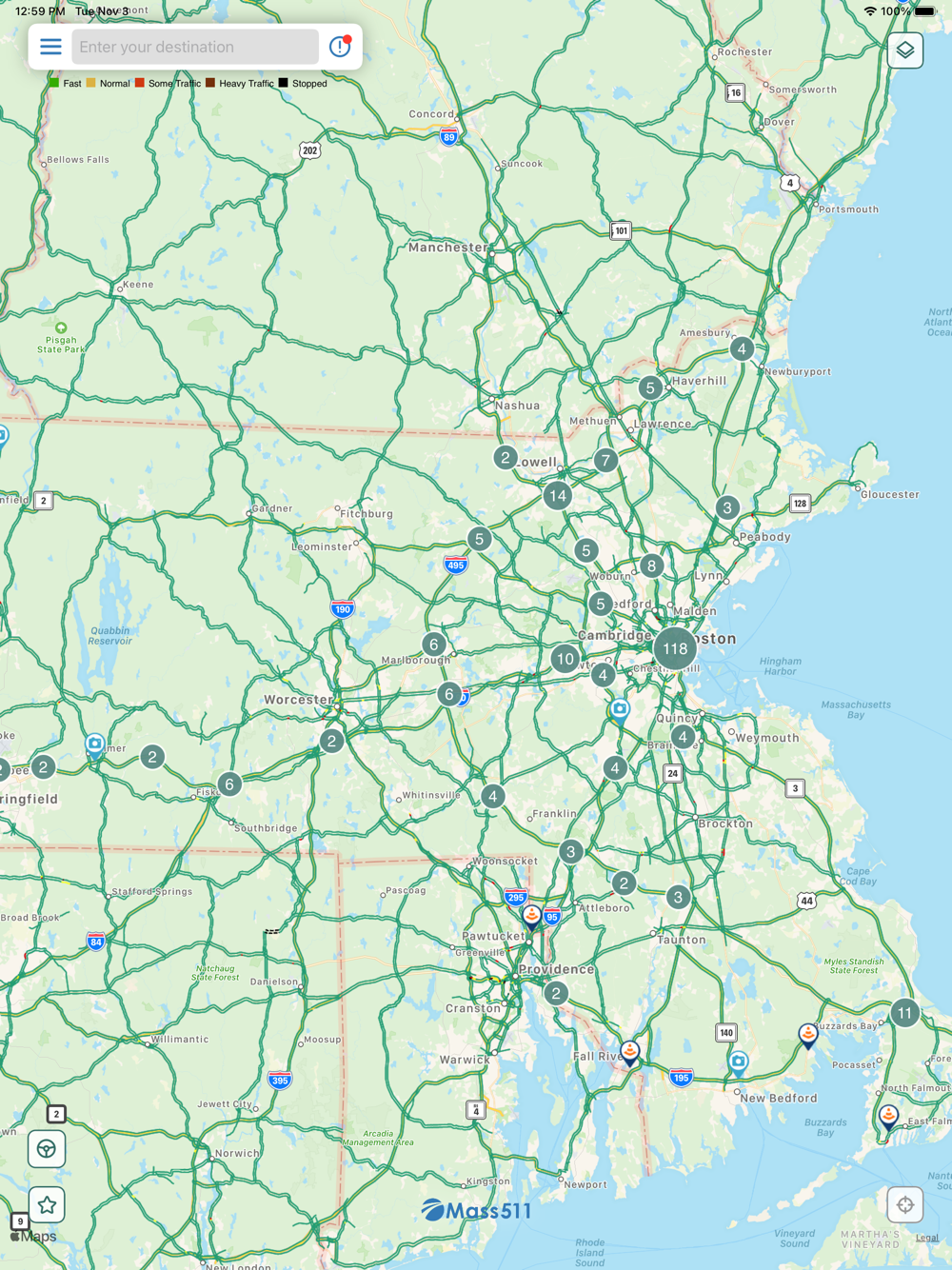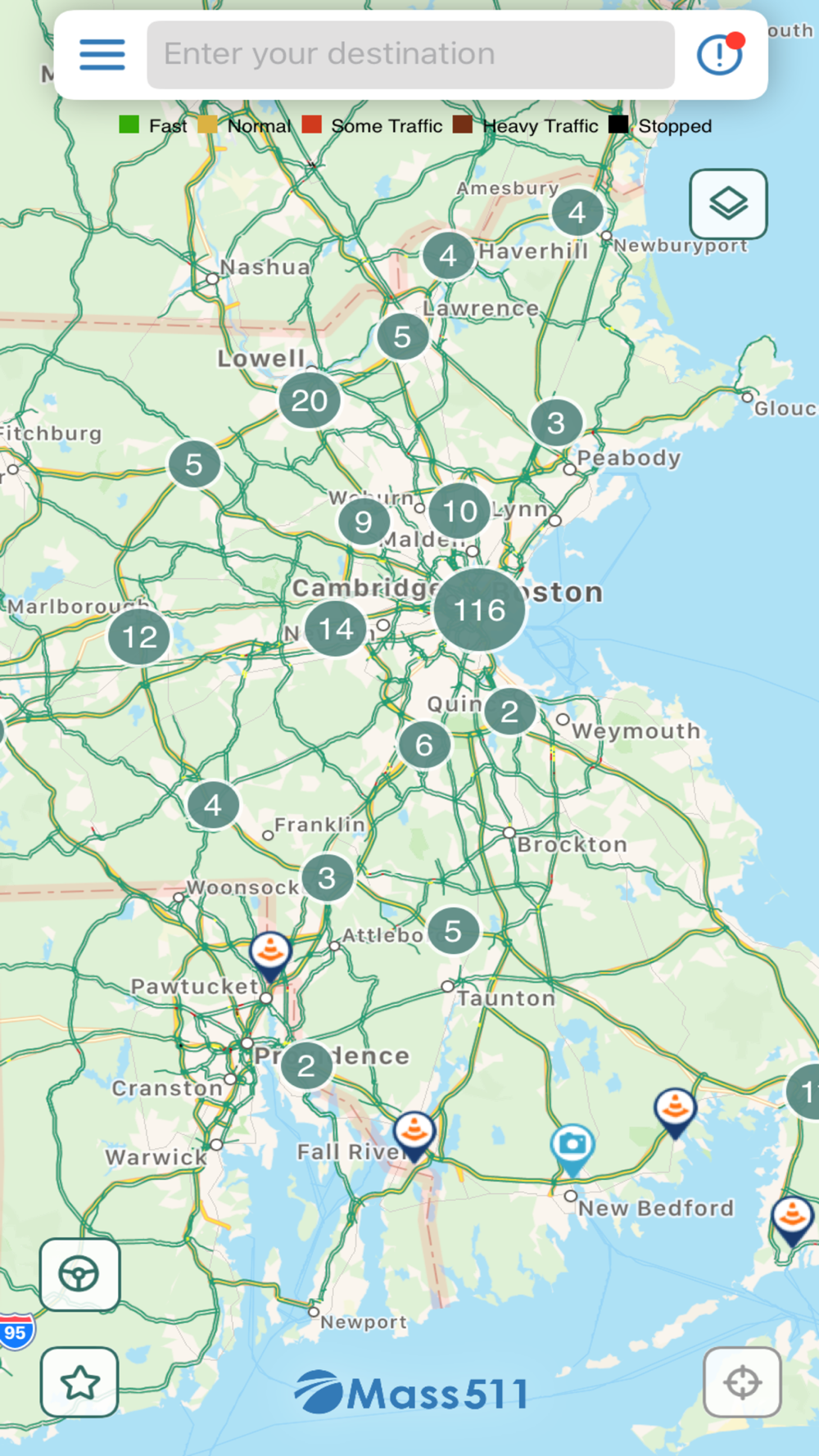 Mass511 is the official traffic & traveler app for Massachusetts commuters and travelers. Published by the Massachusetts Department of Transportation (MassDOT), Mass511 delivers reliable real-time road and travel information, covering interstates, U.S. routes, and state highways. Unlike other traditional map applications, Mass511 draws from live traffic and incident data from MassDOT Highway Operations Center. And that means you’ll know what’s going on as it happens.