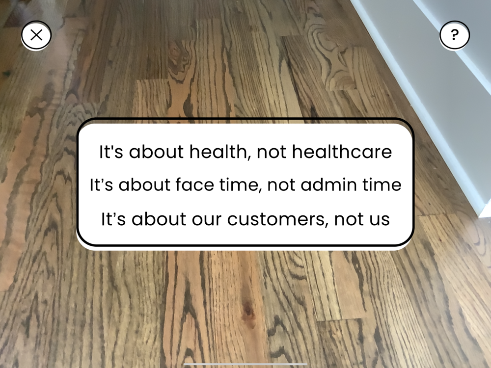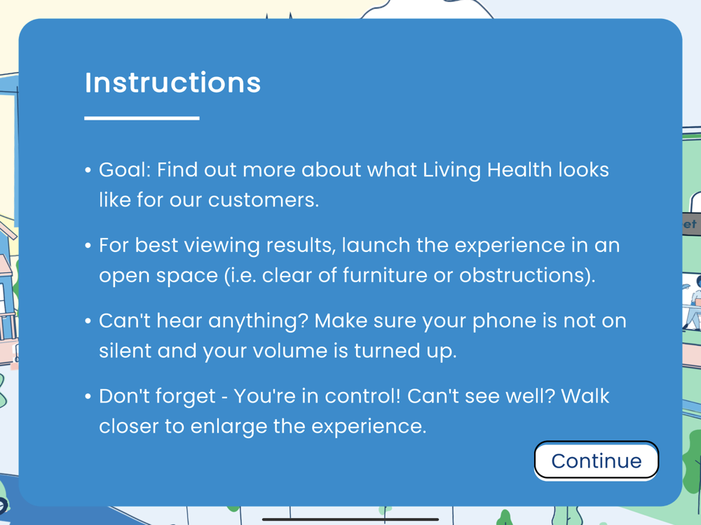 After Downloading and entering the app, you will be taken through an augmented reality experience that brings the future of healthcare to life. A mural will be projected on wall in your home or office, here, you can listen to our individual customer stories; to enhance the overall experience you are able to move closer or further away from the mural.