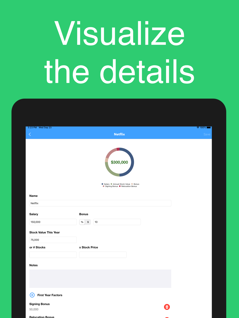 -If you're looking for a job, you can use this app to keep tabs on the different companies you are interviewing with. You can add notes on important deadlines, as well as begin to fill in compensation information as you get offers in hand with numbers. Then you can project these numbers out up to 8 years to see what the full package picture looks like over time, again adding in factors such as estimated salary and stock growth.