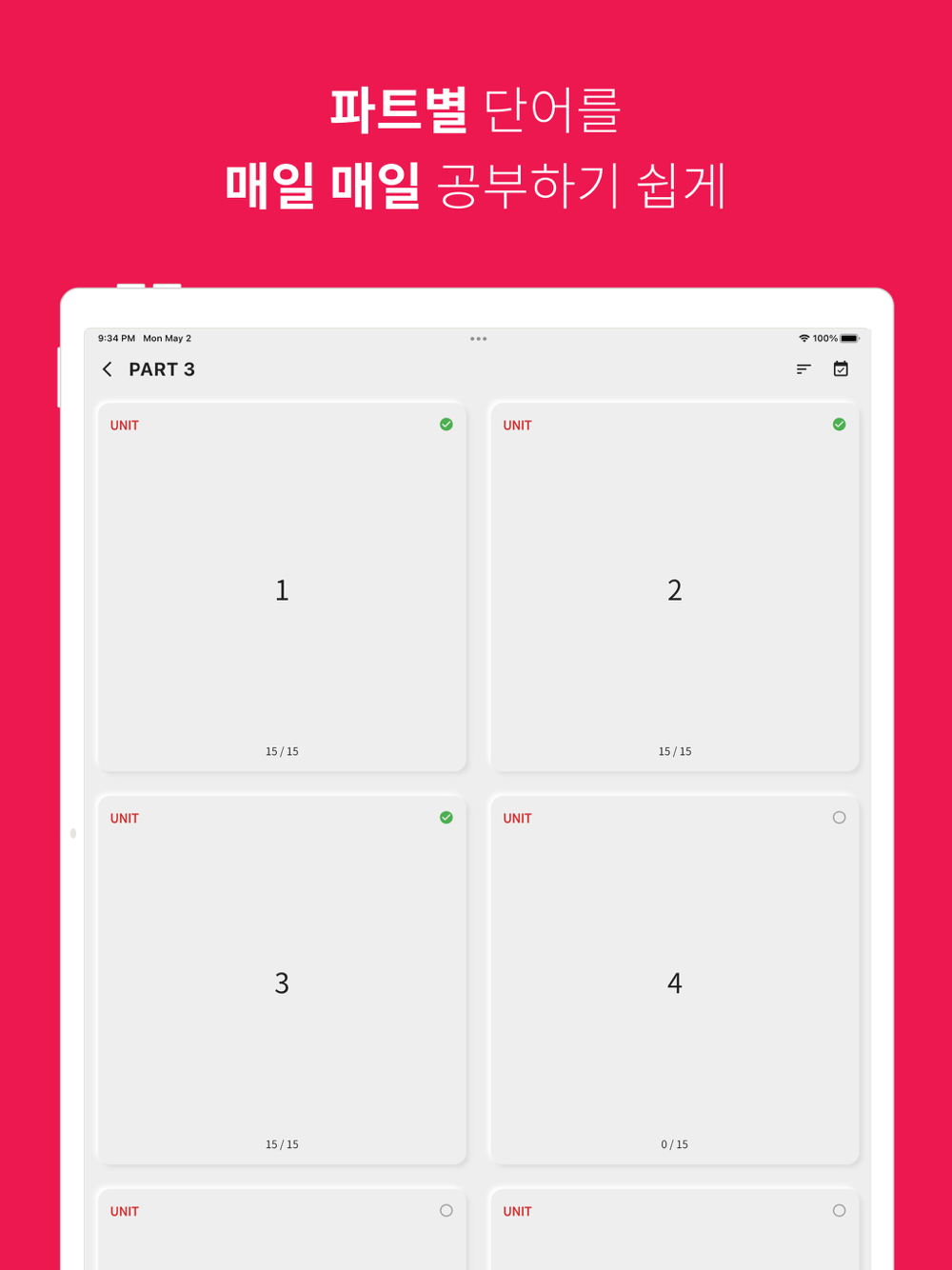 - 학습 진행률 설정/초기화: 파트 또는 유닛을 길게 눌러 학습 진행률을 설정하거나 초기화할 수 있습니다.