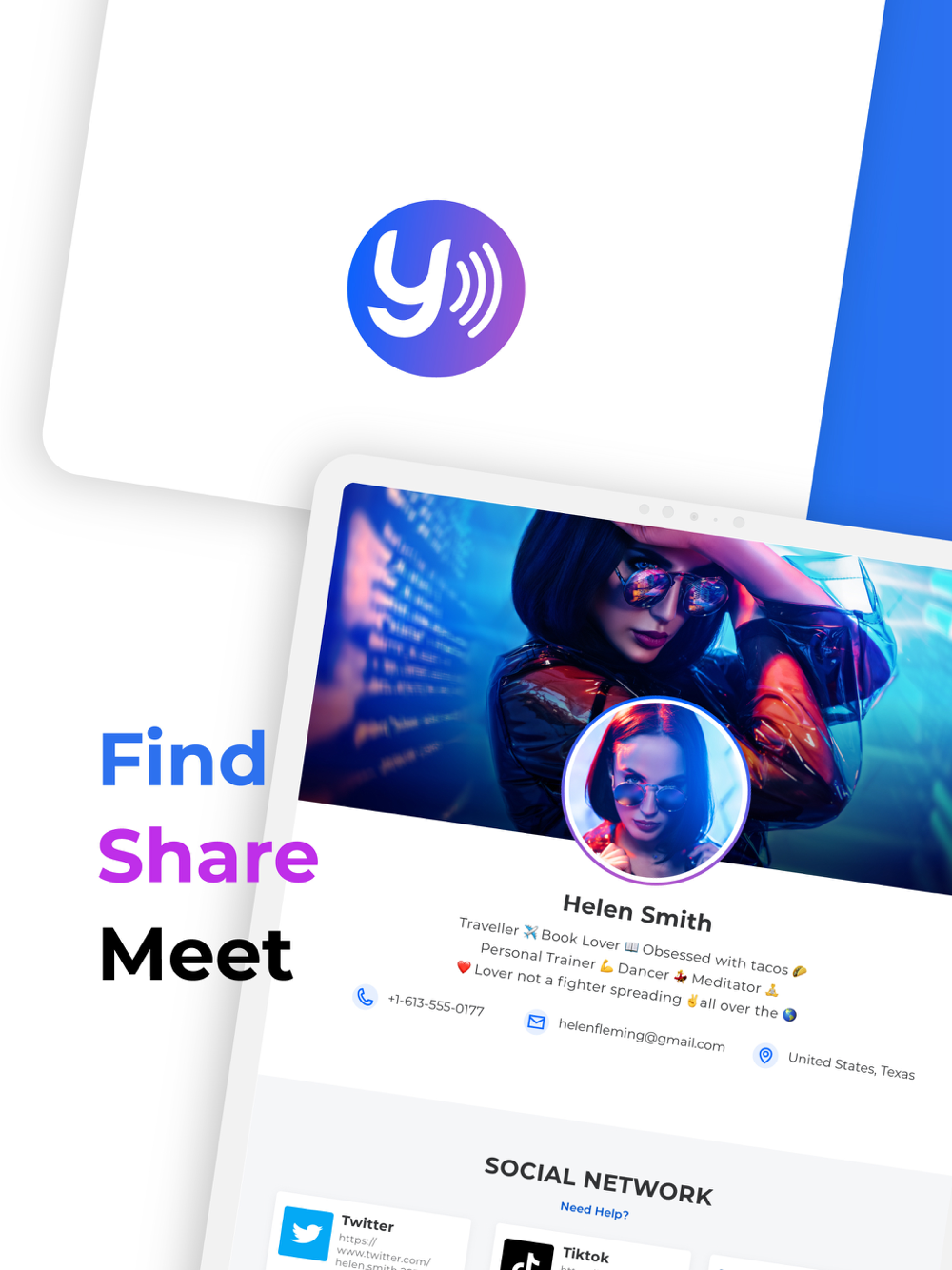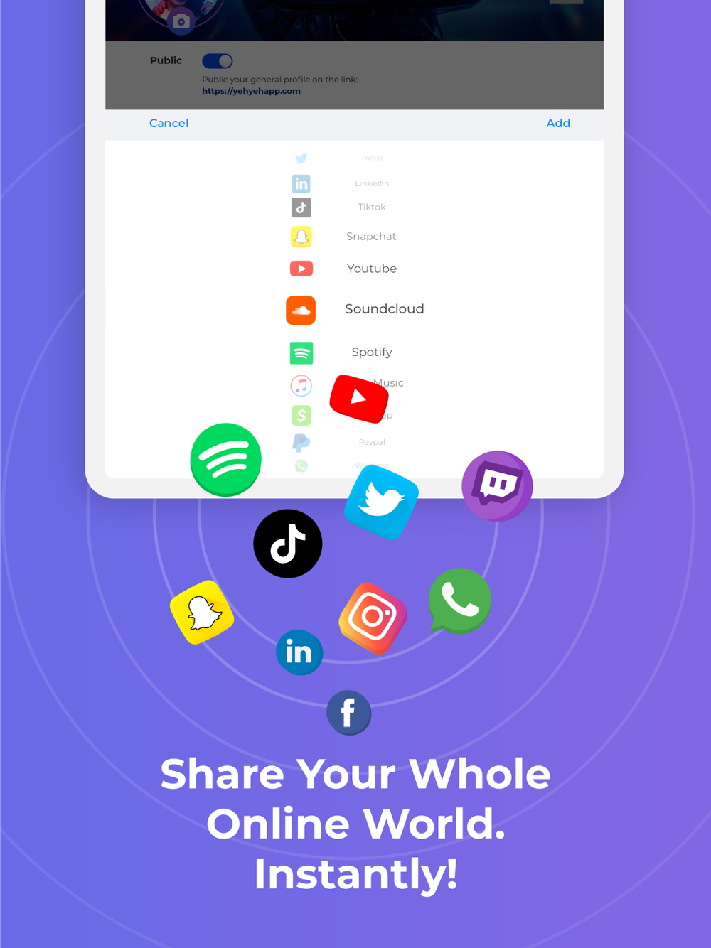 This is the next-level way to connect with people. Save your social media profiles and contact information in a personalized YehYeh profile and share it all in one tap. Do away with the chore of swapping contacts and trying to remember all your usernames with a simple tap of your phone.