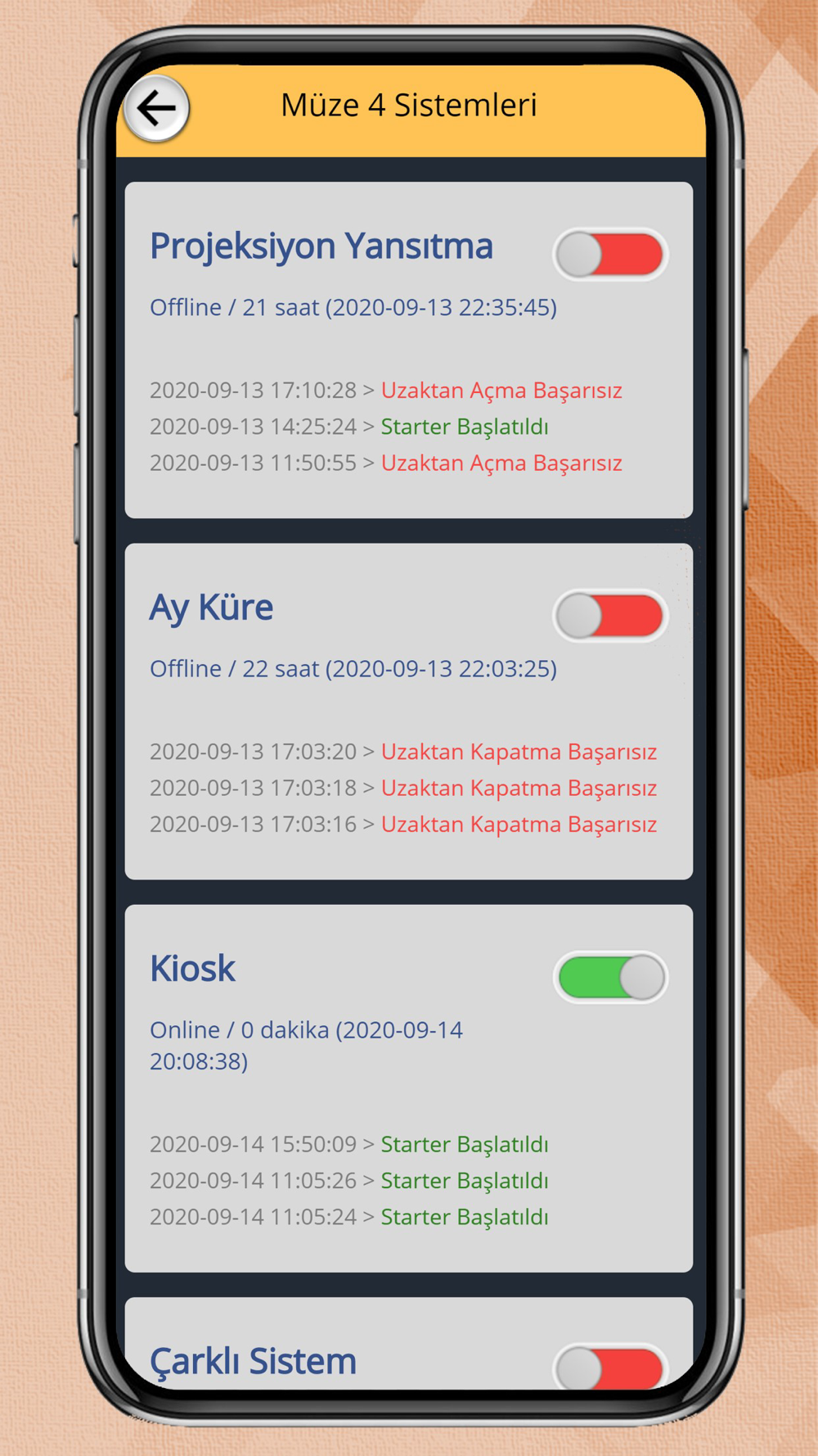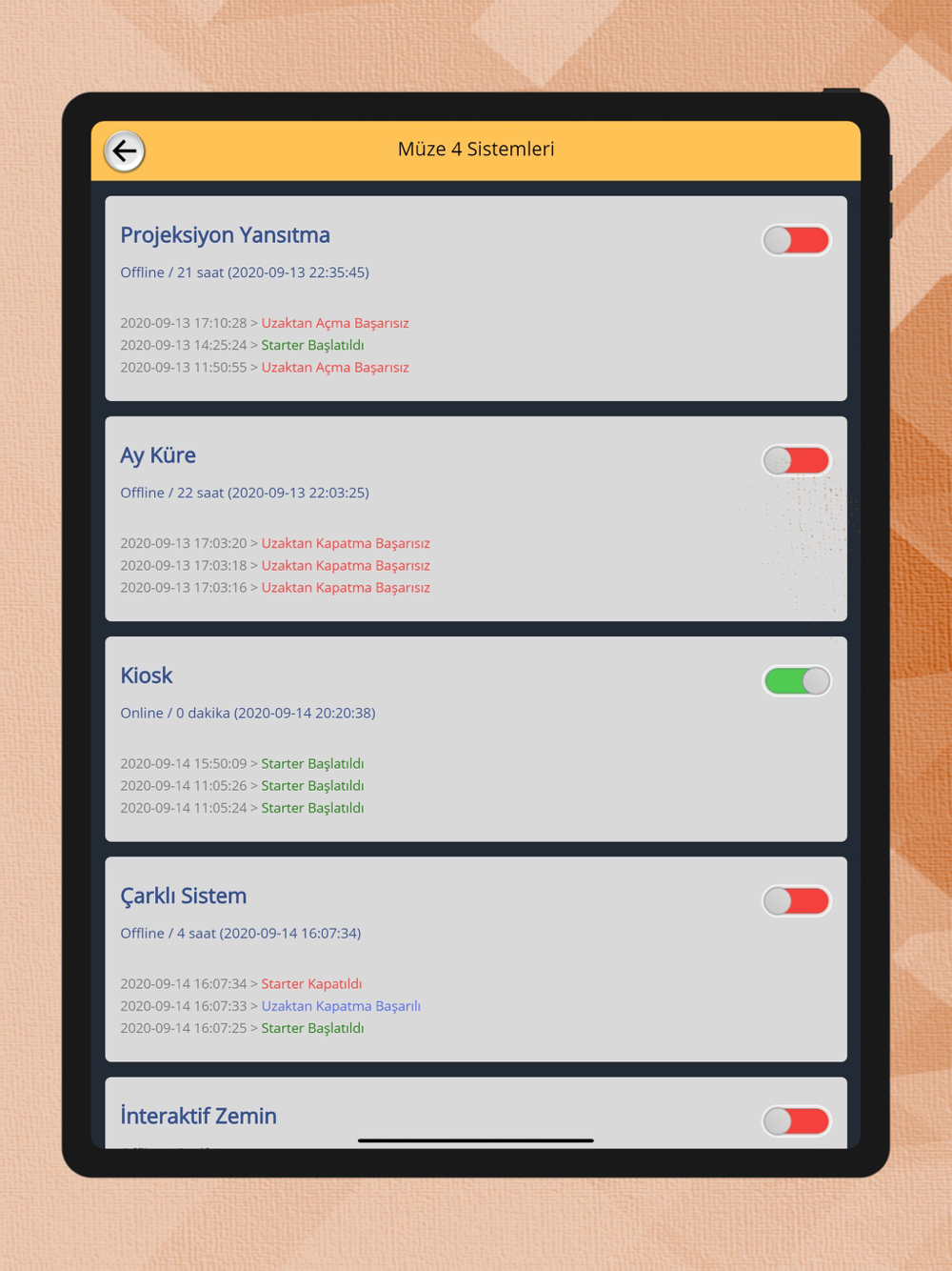 RemoteApp ile sergi ve müze alanlarında yer alan tüm cihazlarınızı uzaktan yönetebilirsiniz. Uygulama ile internet erişimi olan tüm alanlarda cihazınızı açıp kapatabilirsiniz. Anlık olarak cihazın durumunu takip edebilir çalışıp çalışmadığını ve hangi durumda olduğunu takip edebilirsiniz.