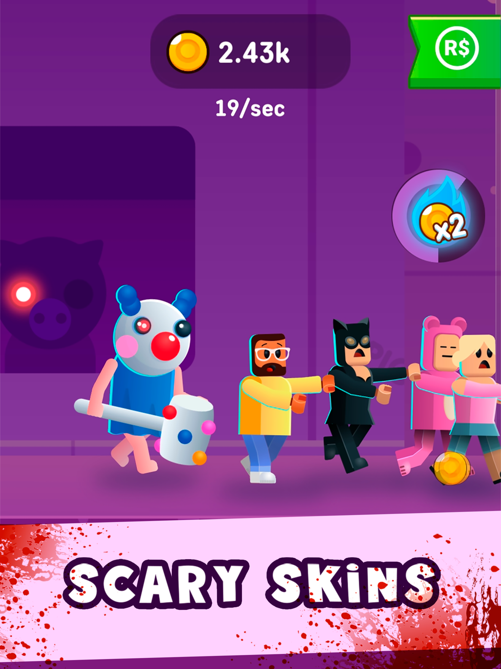Be сlassic piggy or other skin and kick characters. In order for the pig to kill the player, the pig must catch up and kick victim. Watch the creepy pig maniac chase his victims. Catch up with all the characters, no one has to run away from the piggy!