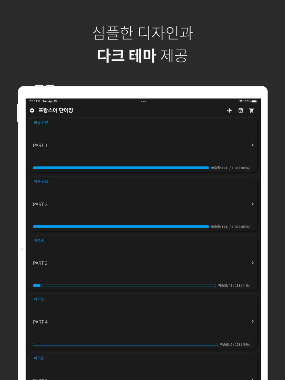 - 학습 진행률 설정/초기화: 파트 또는 유닛을 길게 눌러 학습 진행률을 설정하거나 초기화할 수 있습니다.