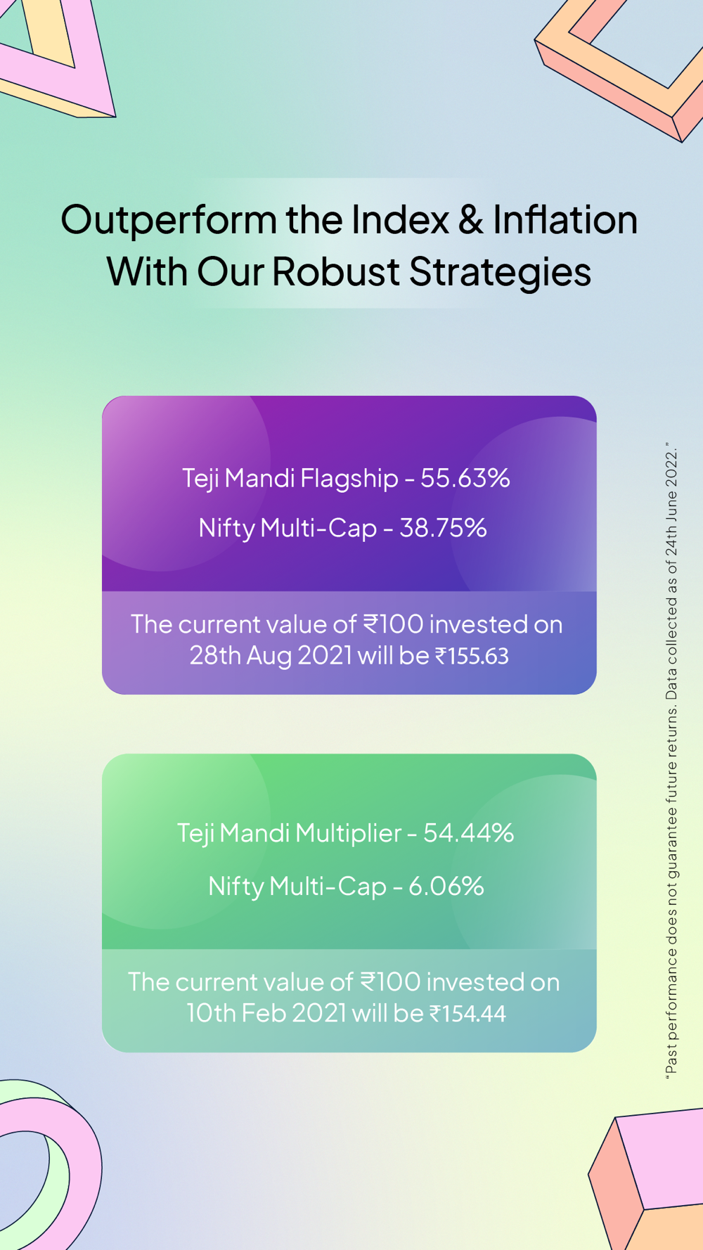 Teji Mandi is your one-stop solution for all your stock investing needs. Based on your risk appetite we help you with stock selection and allocation to build a long-term portfolio. We explain everything along the way, making our subscribers well-informed and better investors than most investors out there. For consistent index beating returns and high-quality advisory, Teji Mandi flagship portfolio has a focused stock picking and disciplined rebalancing strategy. Where we advise our subscribers to exit losing stocks and enter potential stocks.