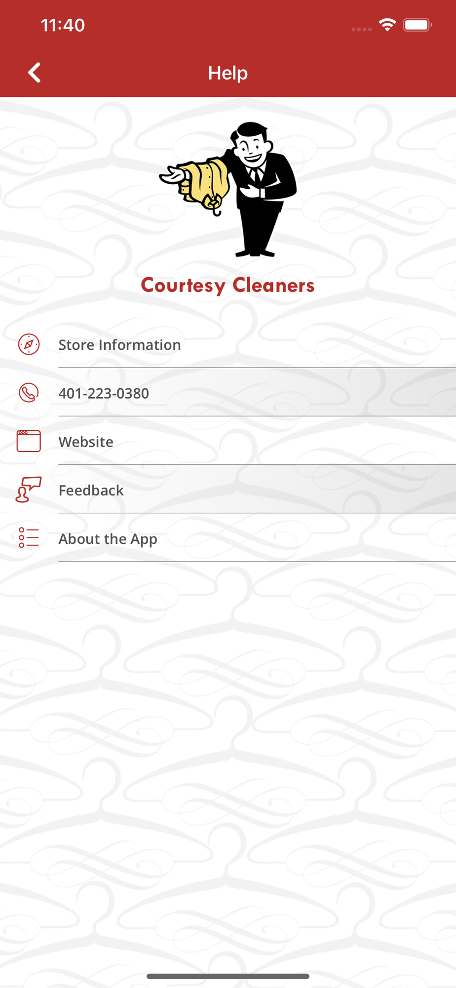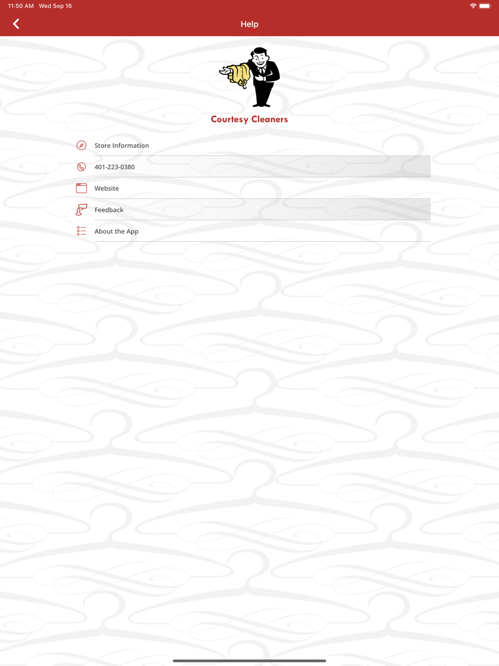 5) Quickly contact Courtesy Cleaners by phone or email and access their website all directly from your device.