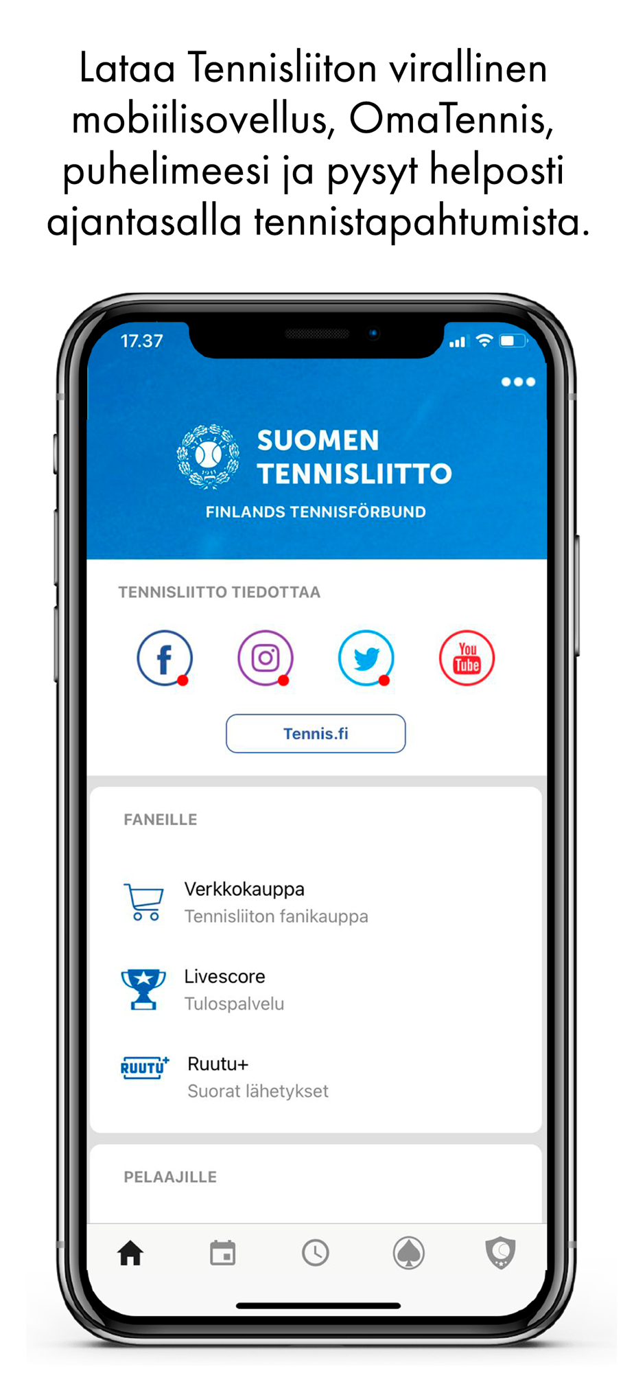 - Kaikki uusimmat uutiset Tennisliiton verkkosivuilta ja kaikista sosiaalisen median kanavista. Näitä sivuja pääset seuraamaan ilman sosiaalisen median tunnuksia ja kirjautumatta. Kaikista uutisista saat myös halutessasi push-ilmoituksia ja pysyt ajantasalla.