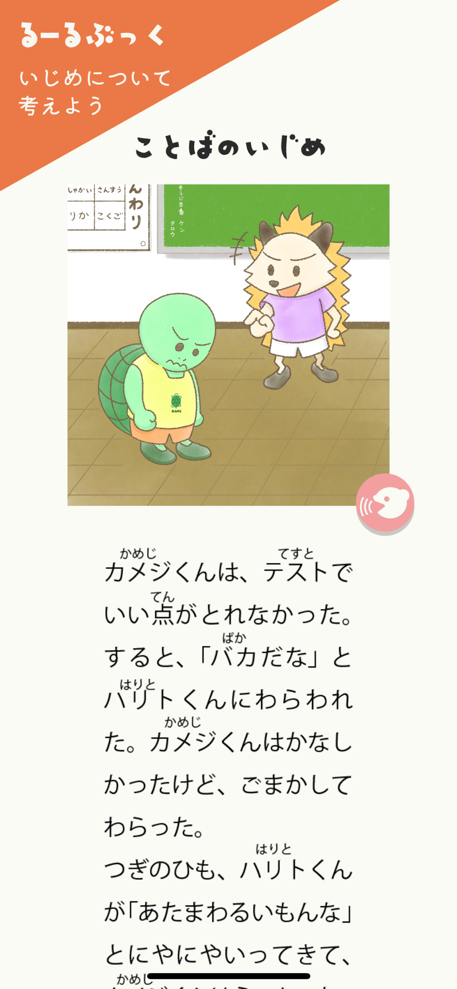 就学前〜小学生に知ってほしい「いじめのお話」を7つに分けてまとめています。読み上げ機能付きでお子さまひとりでも聞くことができますが、ぜひご家族でのコミュニケーションにもご活用ください。