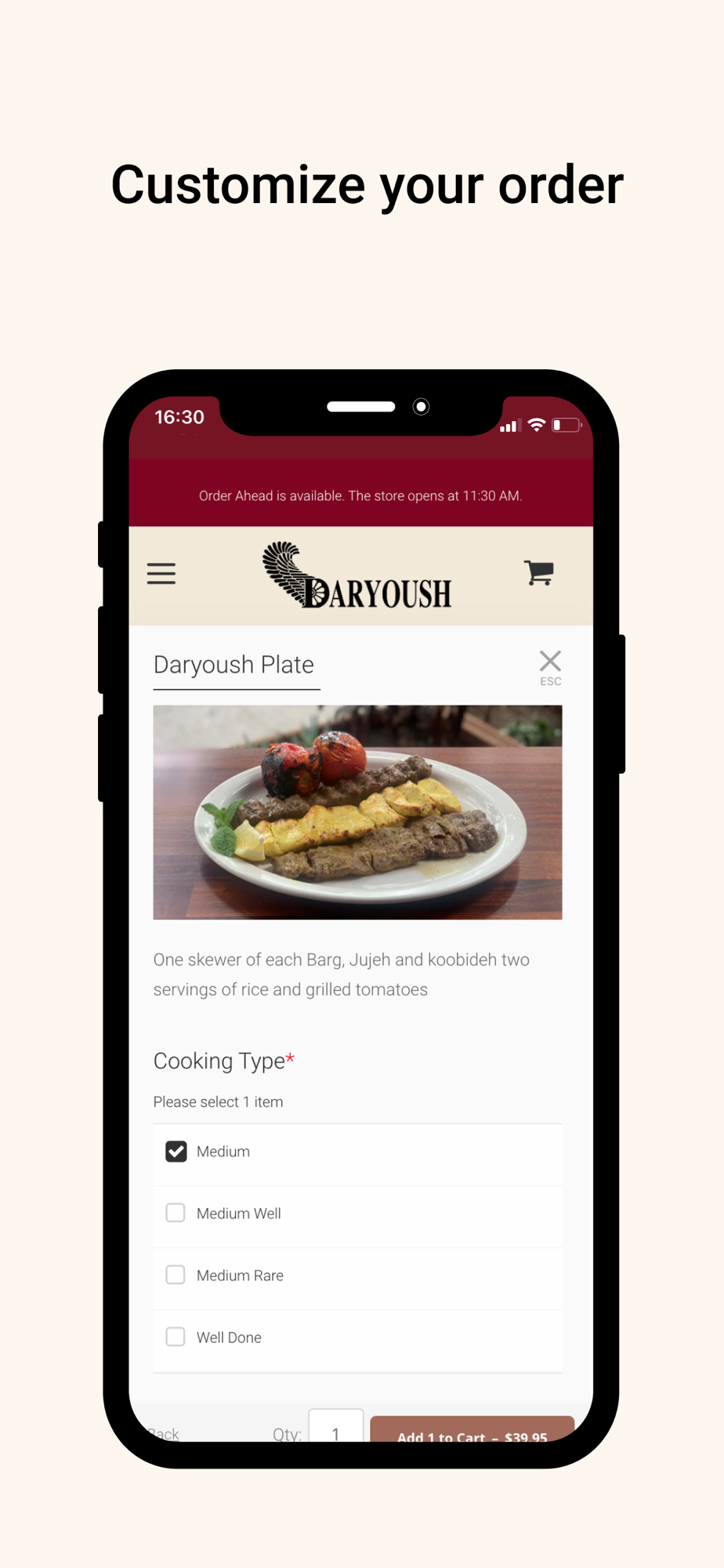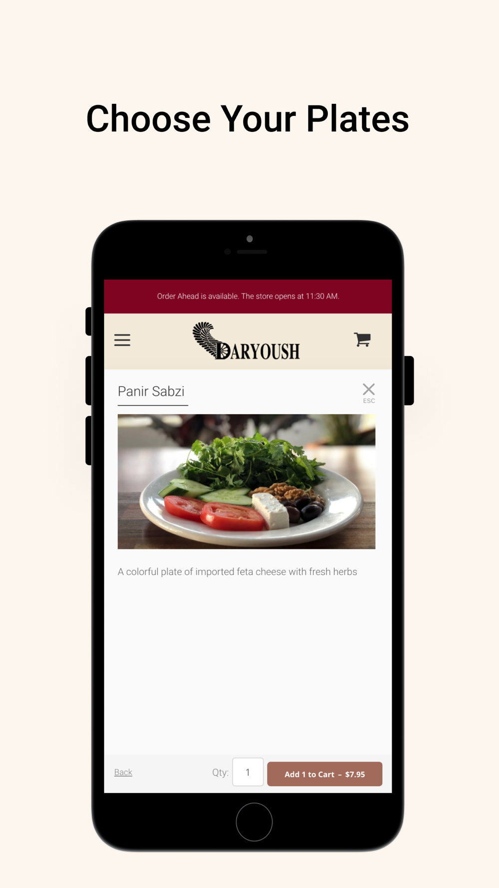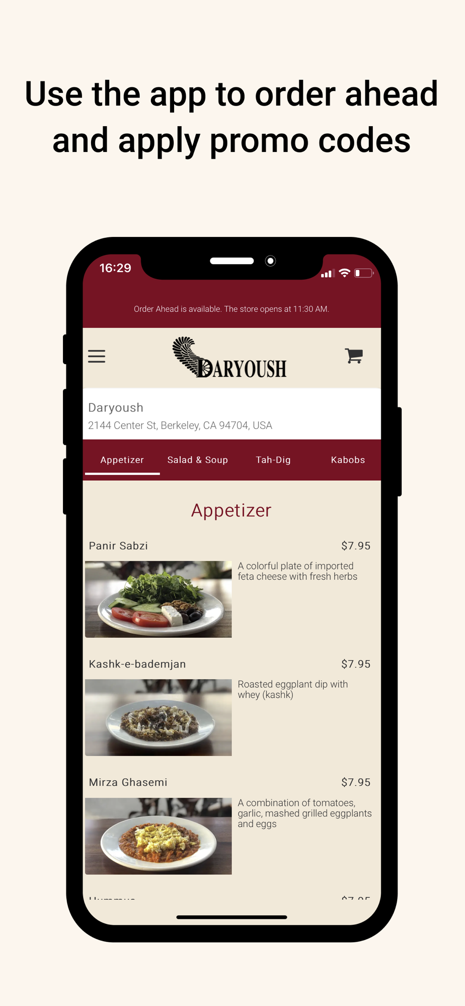 Daryoush is a unique dining experience, Authentic Persian cuisine with a beautiful setting, located just half a block from UC Berkeley and BART at the CENTER of downtown. You can find us at 2144 Center Street Berkeley CA, 94704. Our new app is a convenient and user-friendly solution for online ordering, containing features like order ahead and promo codes.