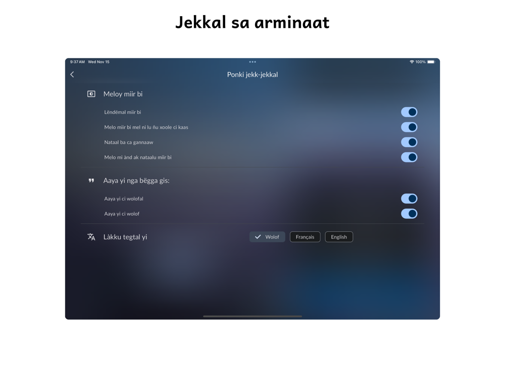 Le calendrier wolof utilisé au Sénégal, son correspondance avec le calendrier occidental jour par jour, tous les fêtes musulmane, chrétien, et laïque, et des versets du Tawreet, Taalifi Cant, et l'Injiil, sur ton portable dans un appli fluide et belle.