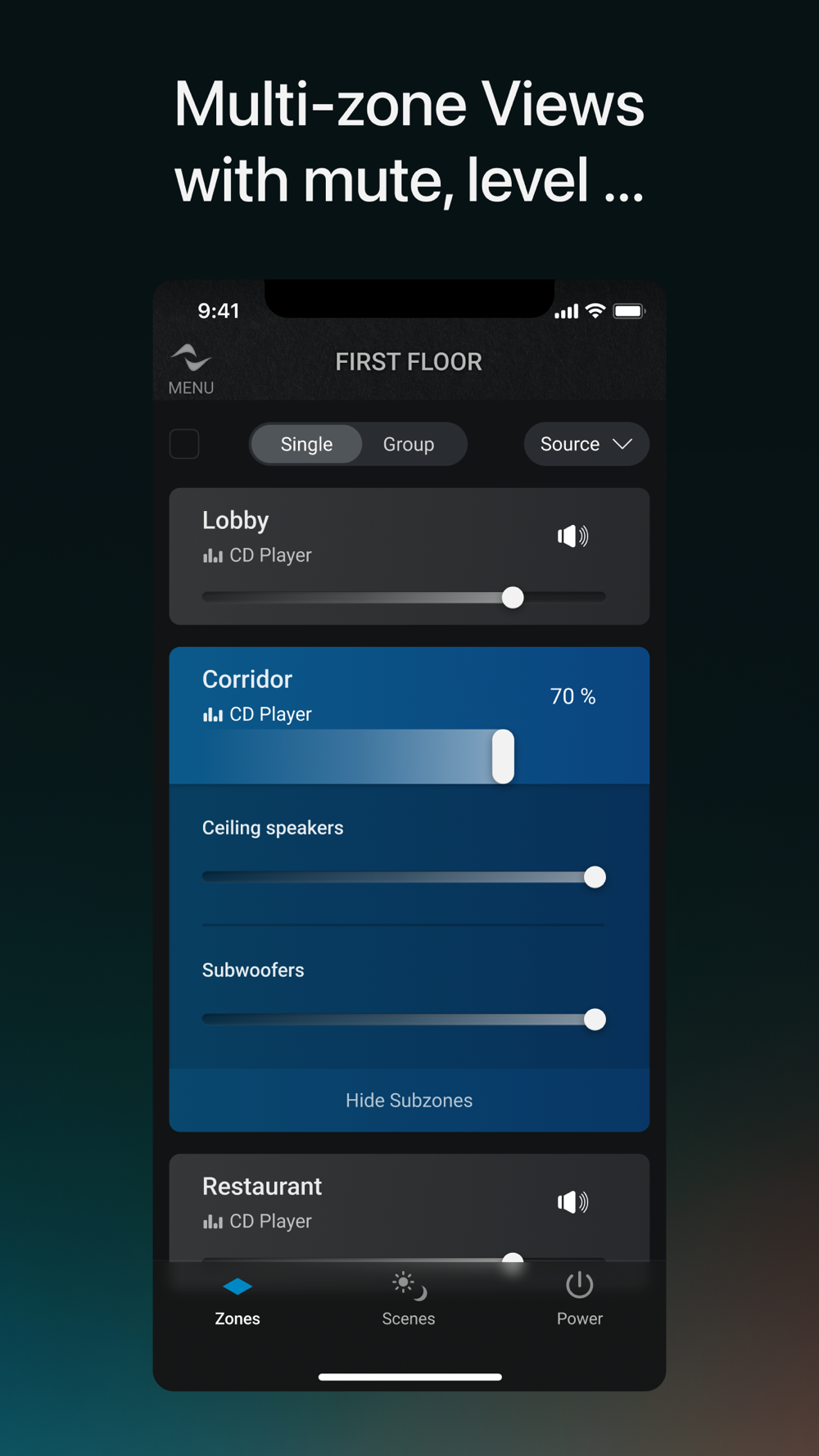 For larger systems you can also adjust the level of a group of zones simultaneously.