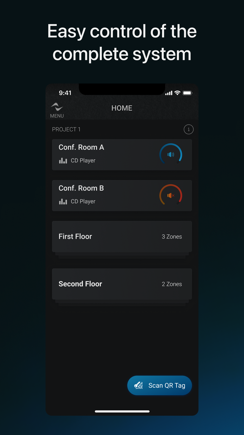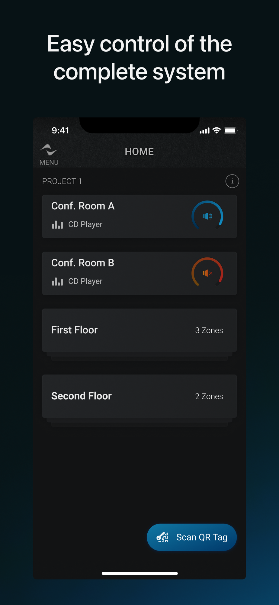 Connect to a system by scanning the network in the Home page, or simply tap the Scan QR Tag button to open the control interface.