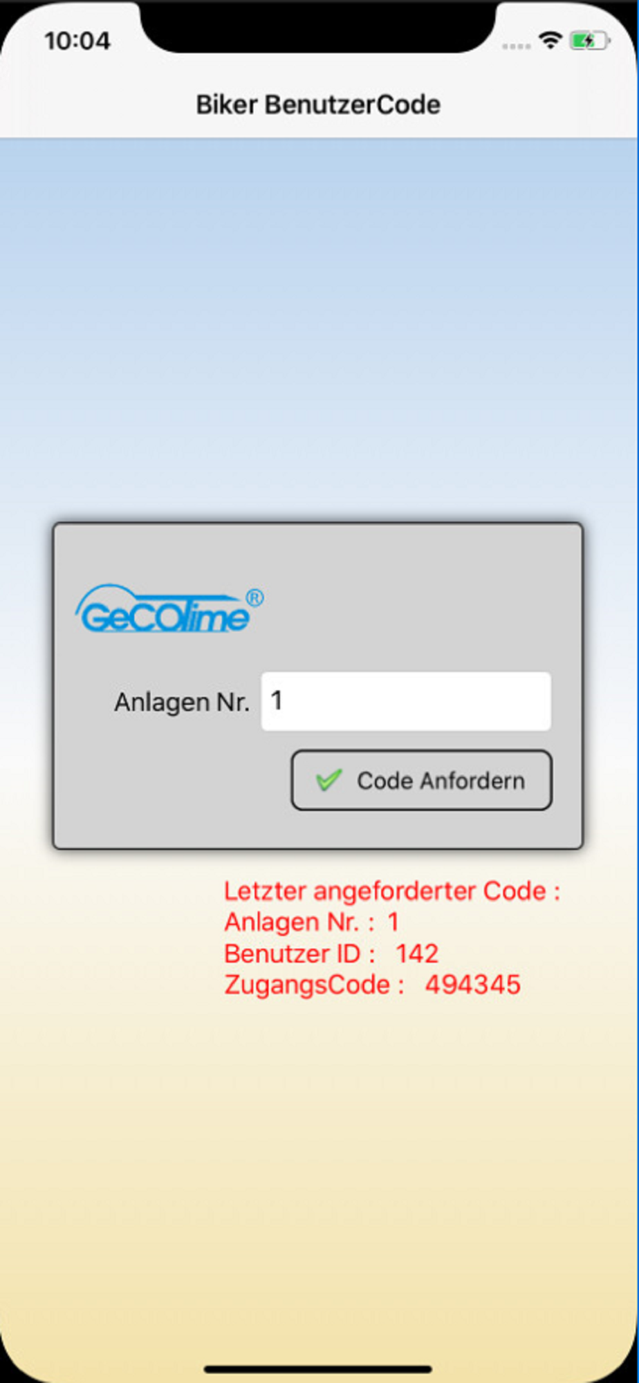 Bitte geben Sie die Anlagennummer an und drücken Sie dann den Button “Code Anfordern“. Sie erhalten umgehend ein PopUp in dem Sie ihre ID und ihren Zugangscode angezeigt bekommen. Mit diesen Codes können Sie die ausgewählte Anlage betreten.