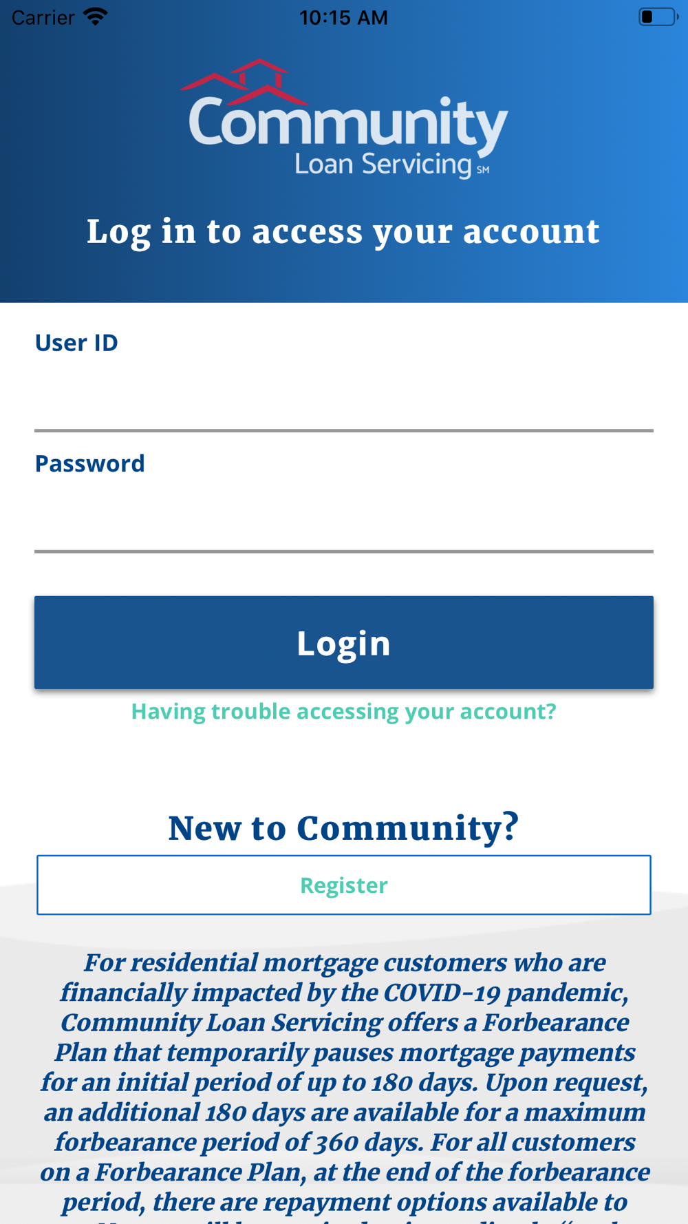 Residential and commercial customers whose mortgages are serviced by Community Loan Servicing LLC can use this app to: