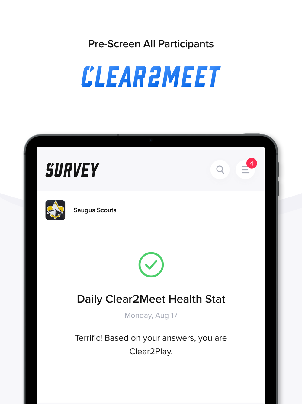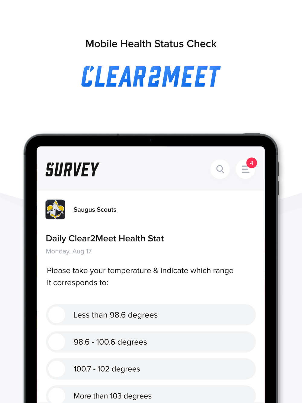 Clear2Meet provides organizations with daily HealthStat surveys, real-time mobile and web health status alerts, and comprehensive reporting, all in an easy-to-use mobile application accessible at home, in the car, and at YOUR MEETING VENUE.