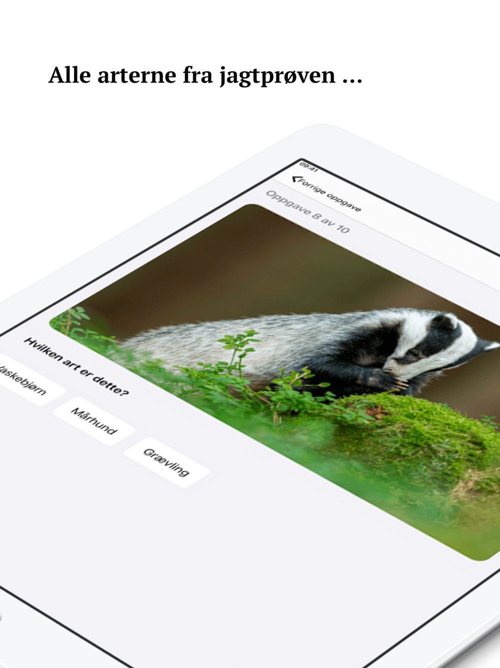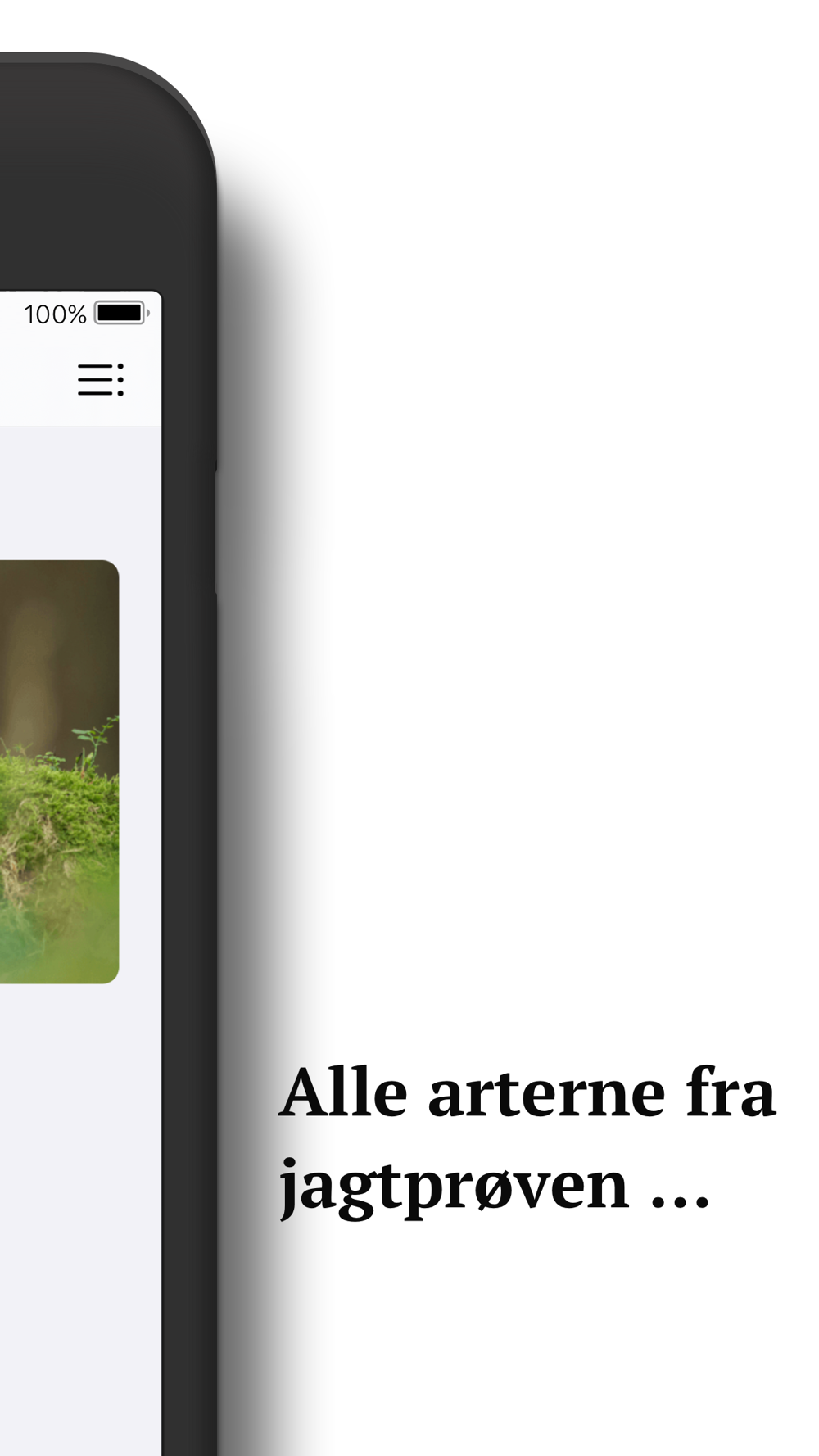Jægerappen indeholder opgaver og en artsliste over alle de arter, der er inkluderet i pensum til jagtprøven. Appen lærer dig hvad du behøver at vide om vildtkending.