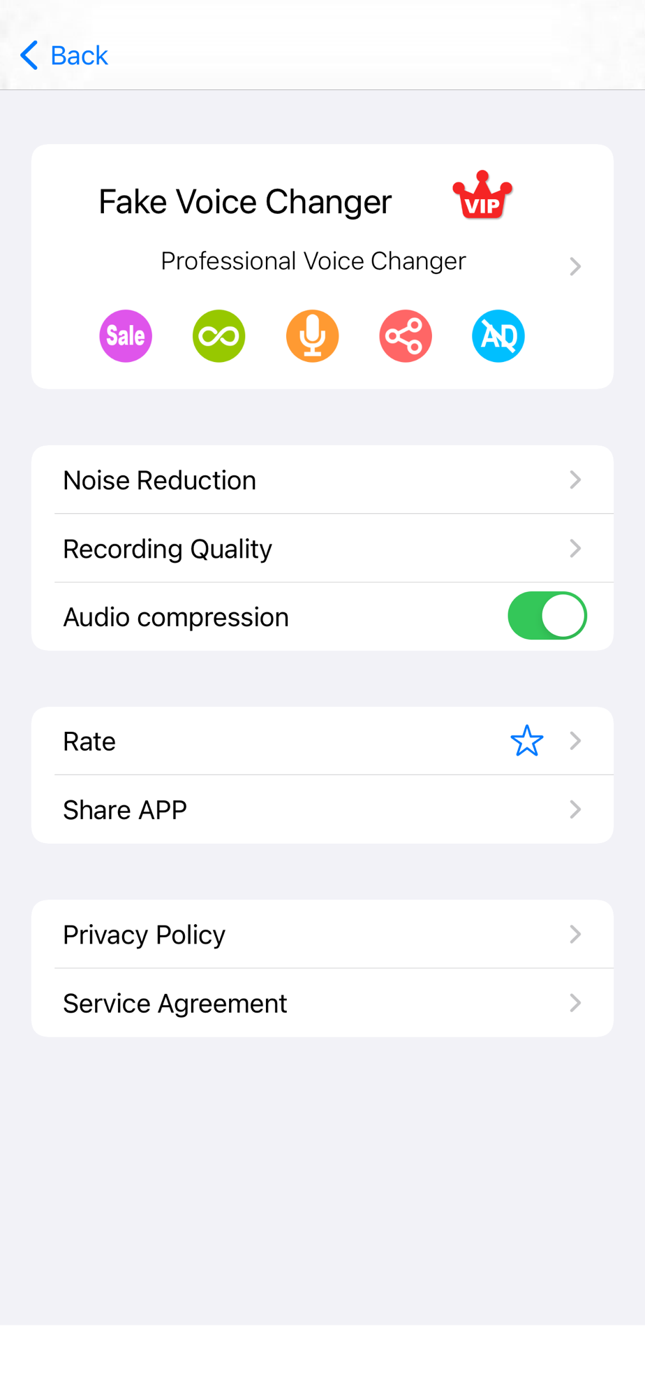 The Fake Voice Changer VIP is a subscription that provides access to enhanced features and ads removal.