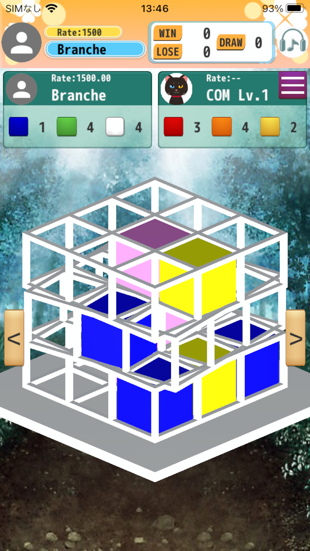 縦、横、ななめのいずれかで同一色のキューブを先に3つ揃えた方が勝ち。