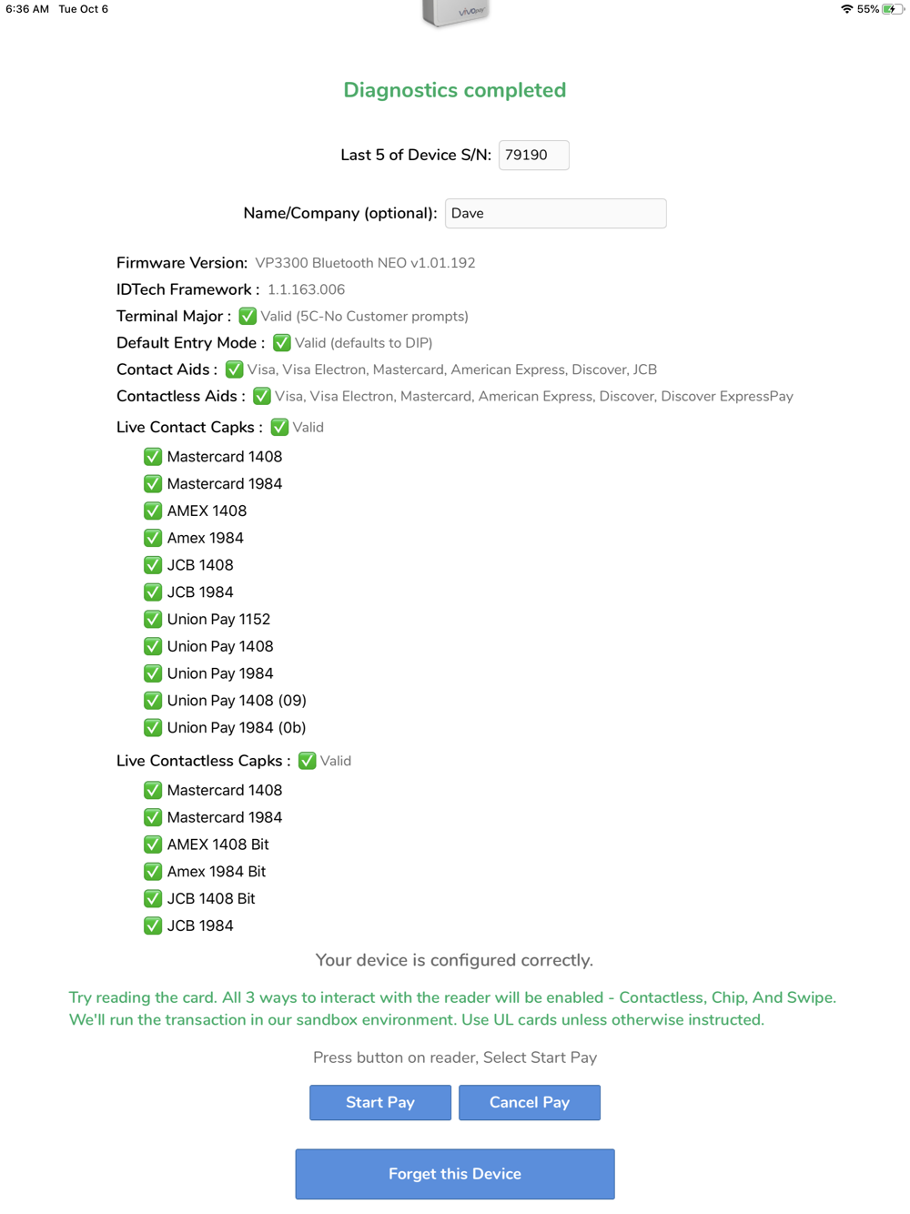 This app will allow you to connect via Bluetooth to see how your VP3300 reader is configured. Just enter the last 5 digits of the serial number printed on the bottom of the reader and once connected it will read through some key parts of the configuration and give you a summary.