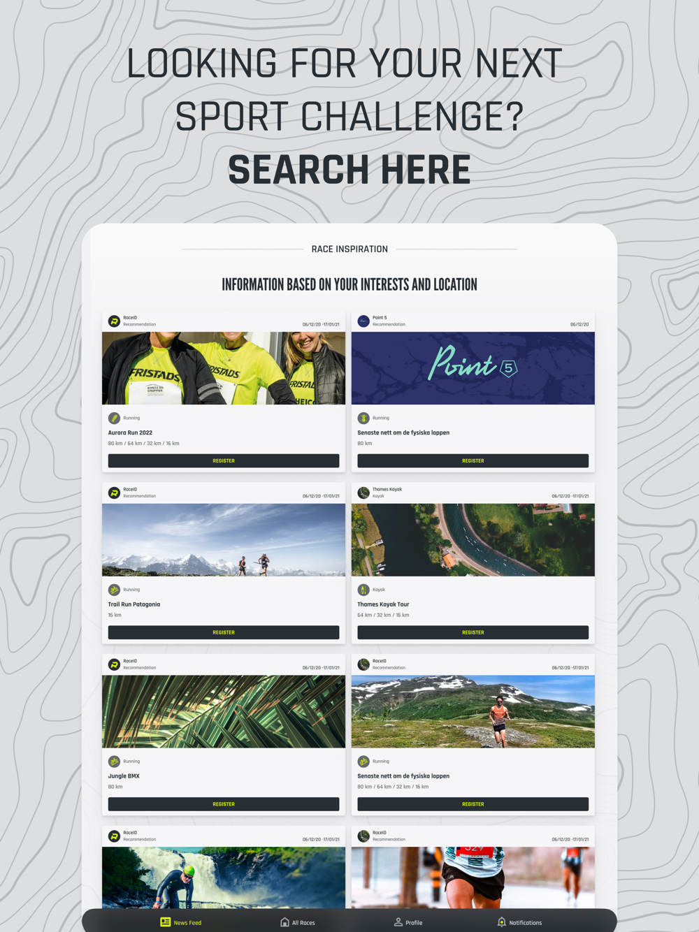 Looking for your next challenge? Search here! Whether it’s running, biking, swimming, adventure racing or any other endurance sport, you will find your next challenge on RaceID.