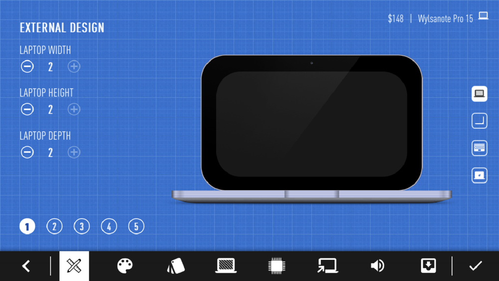 Where to begin? If you don't know what to do, take the first step. You came up with a unique name for your first laptop. A start has been made, now you need to come up with the exterior design of your dream laptop. Create whatever your heart desires - color; width; height; the thickness of the laptop; keyboard size; logo; screen size, resolution and technology; operating system, processor; video card, you can even choose the packaging in which your creation will lie!