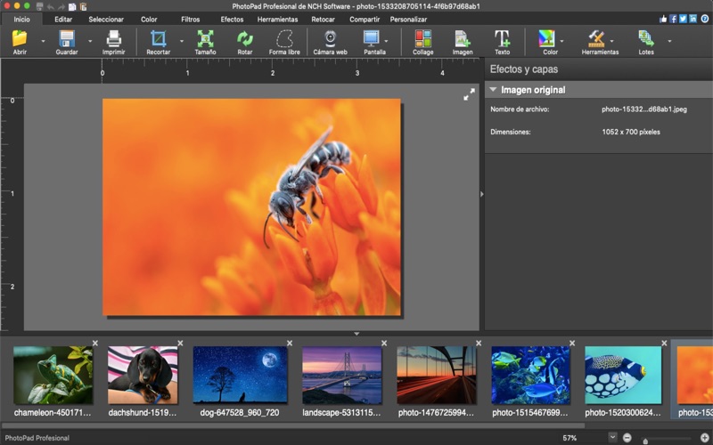 * Aplicar efectos como tonos sepia, escala de grises, reducción de ojos rojos y más.