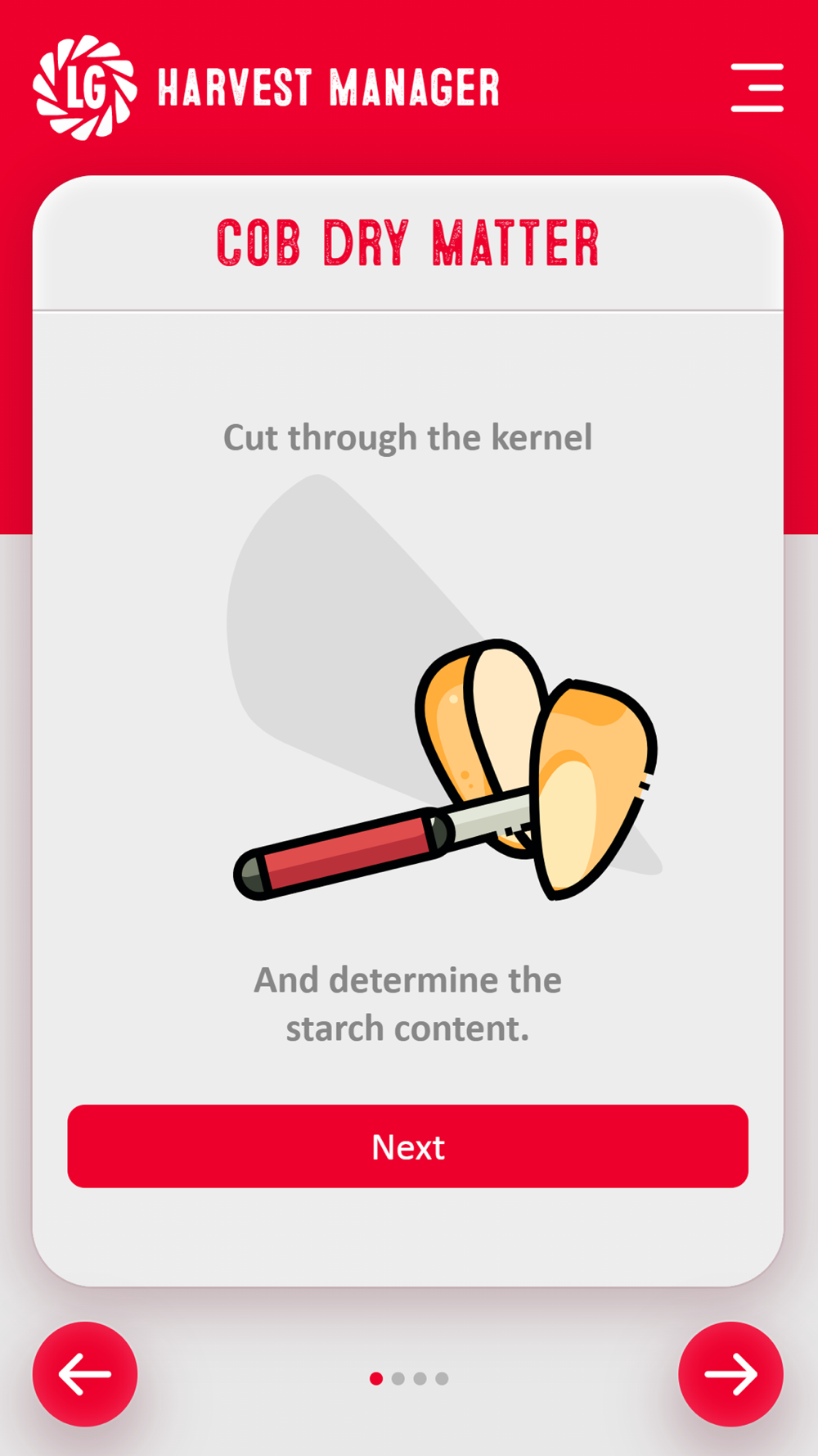 This tool assesses the condition of the crop and advises on target harvest date to ensure the crop is cut at the optimum dry matter to maximise feed values and fermentation quality. A separate assessment is made of the dry matter of the cob and of the stem, the app will then determine if the crop is ready for harvest and recommend a cutting date. If harvest is not imminent, the app uses postcode related weather data to predict when the crop will be suitable for harvest.