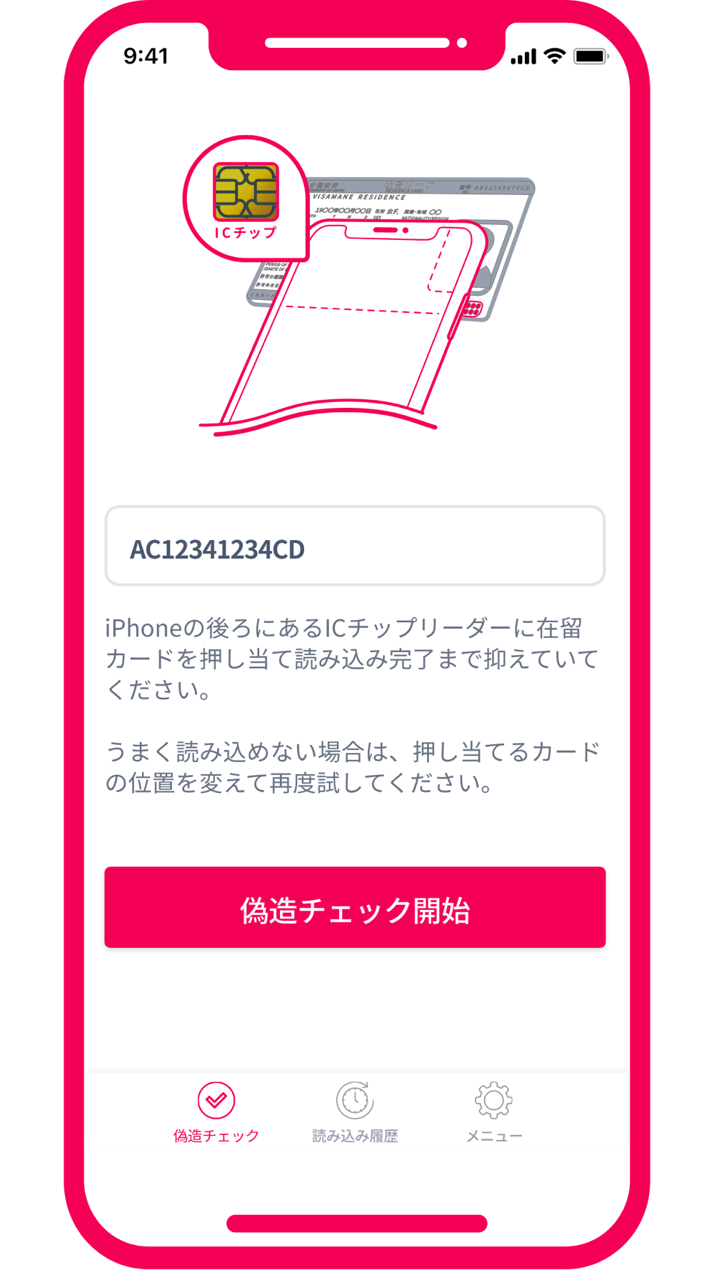 ① 在留カード用ICチップの有無を確認し、偽造在留カードかどうかの判別ができます