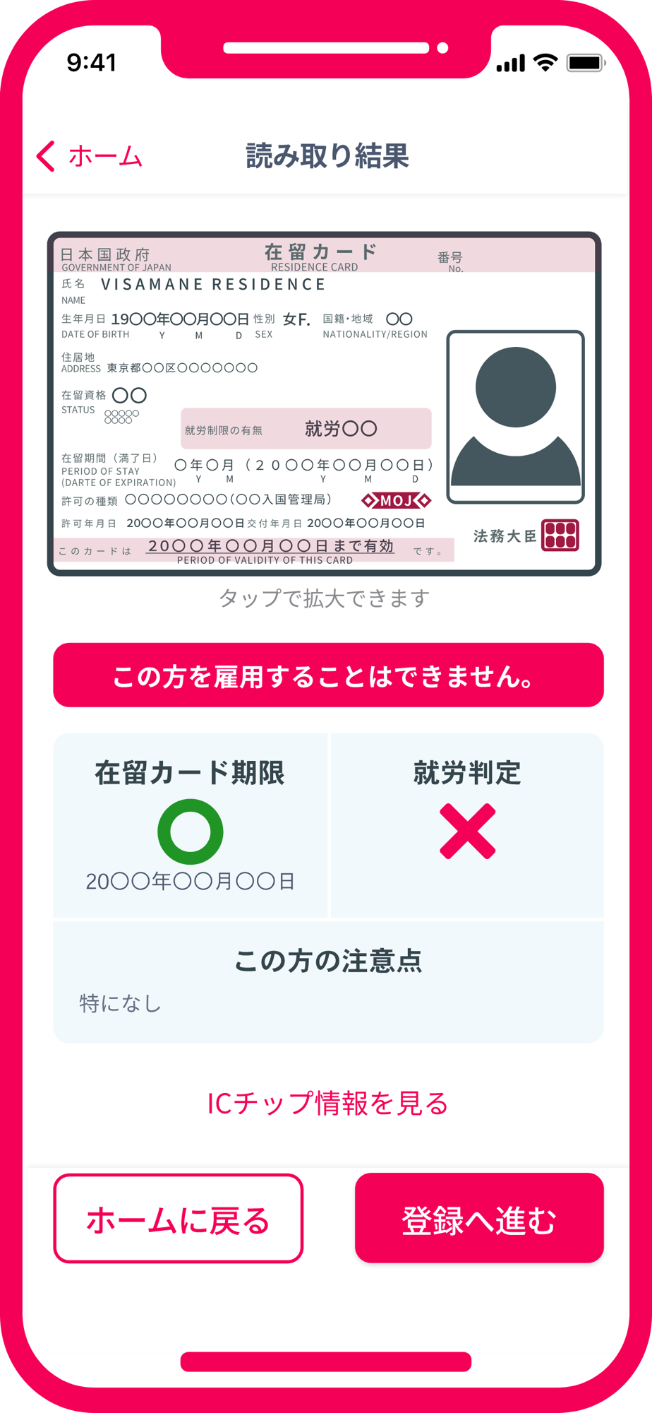 ④ 読み取ったICチップ情報などを基にして、自社での就労が可能かどうかを判定し表示します
