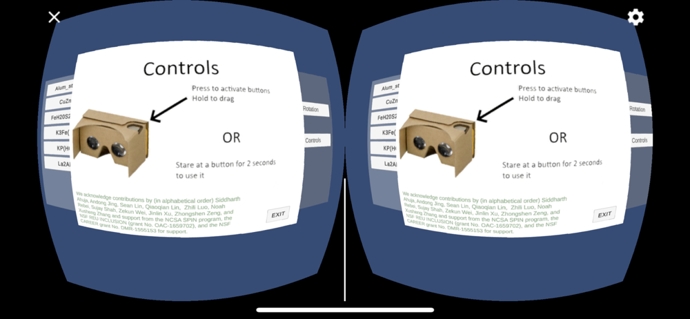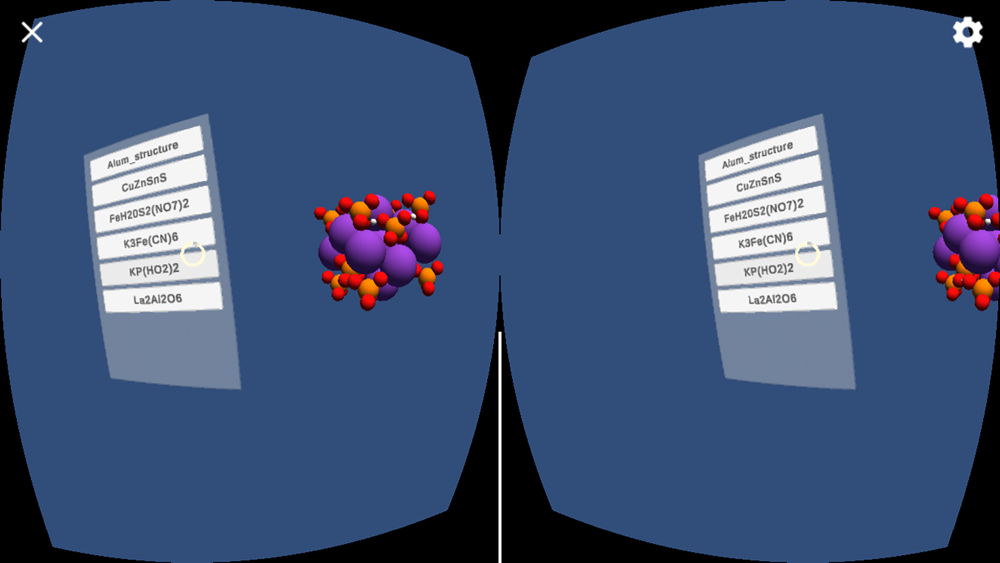 Materials VR uses virtual reality to help students visualize molecular structures. Molecules can be selected from a list and rotated or moved around by the user. The Google Cardboard version includes gaze input which allows the user to gaze at a button for 2 seconds to interact with it.