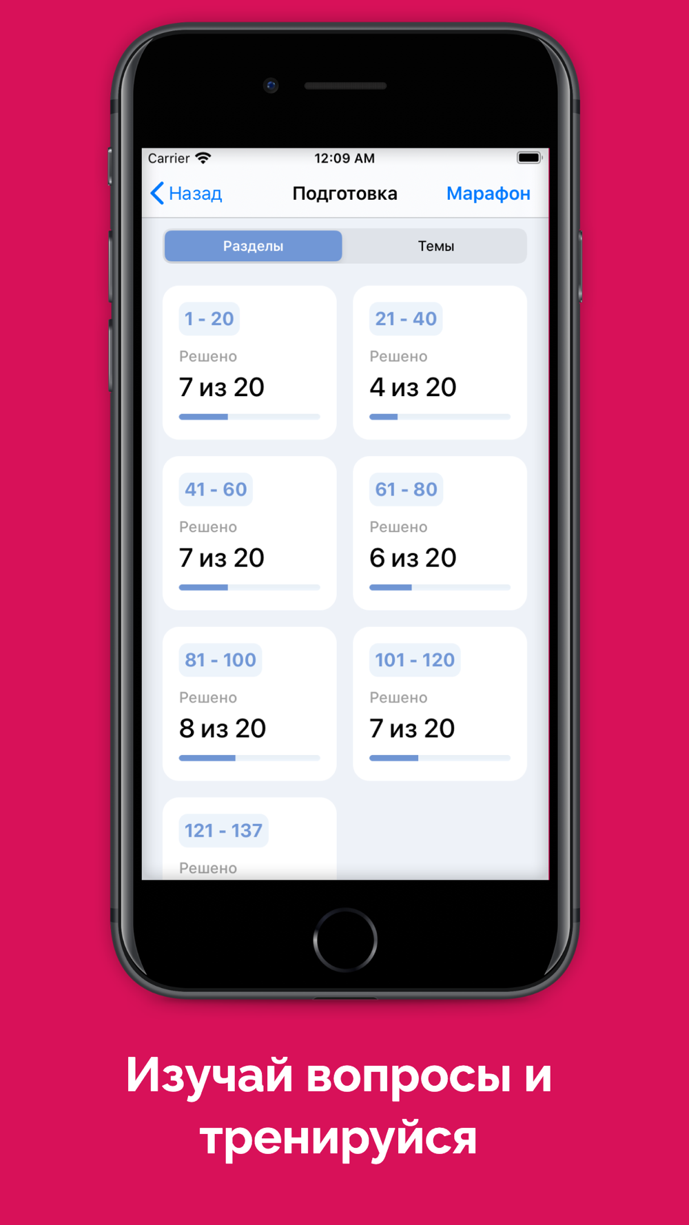 Изучение - открой список из 20 вопросов в каждом разделе, изучи вопрос и запомни ответ.