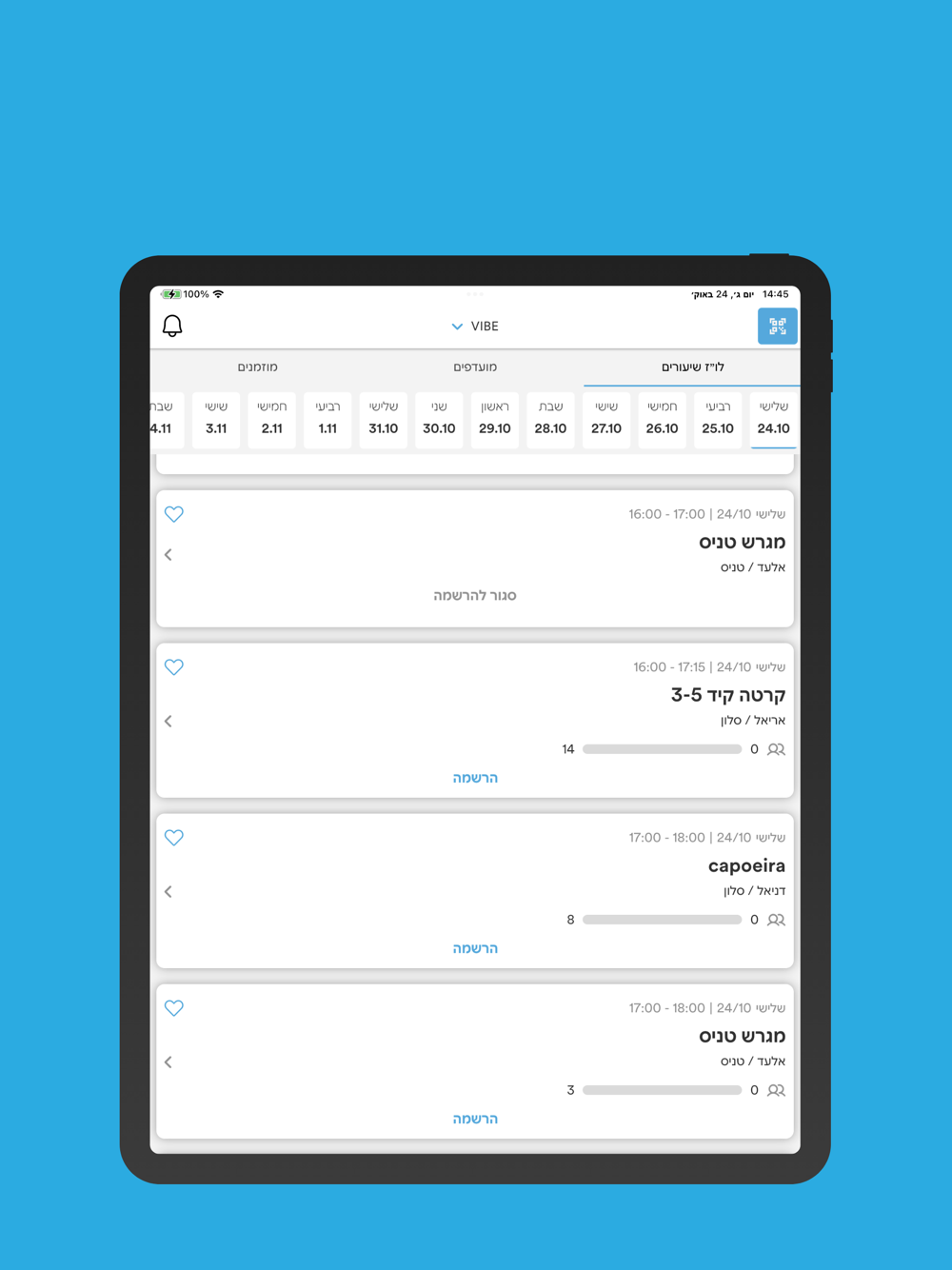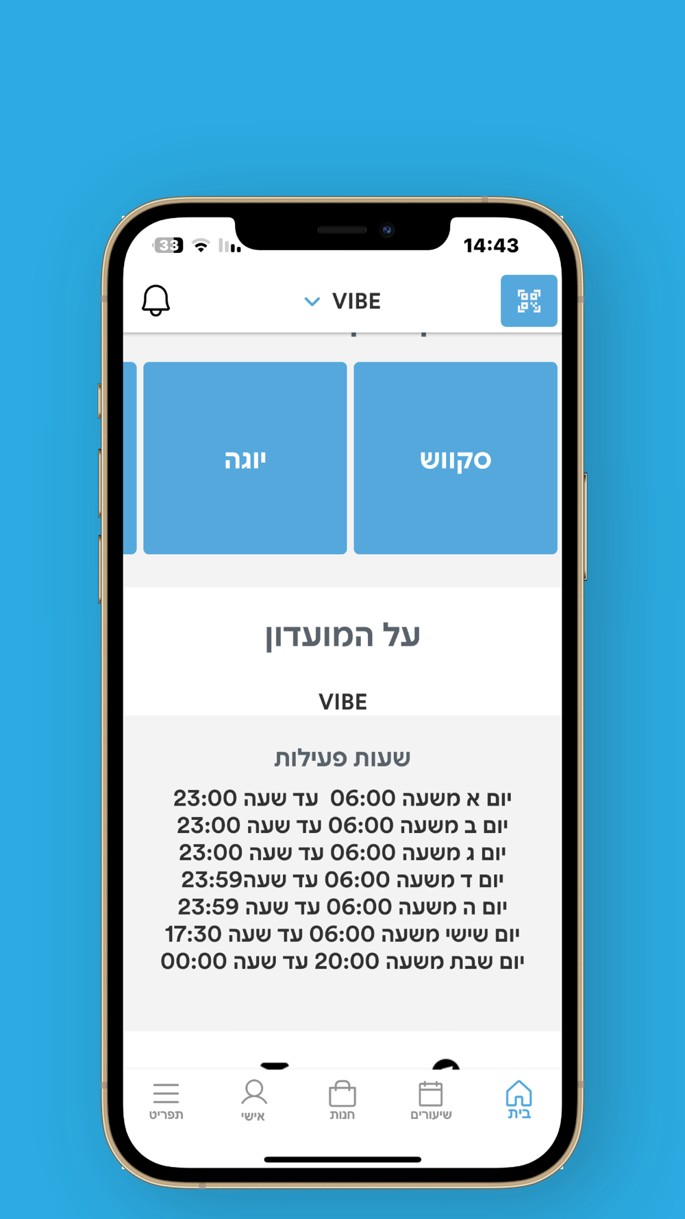 כל מה שצריך לרישום מראש לשיריון מקום בשיעורים סטודיו, פילאטיס,יוגה,קיקבוקסינג ועוד., סימון השעורים המועדפים, הצגת השעורים של המדריך המועדף עליך.אין צורך יותר להמתין לפקידת הקבלה במועדון כדי לבצע את הפעולות הקשורות למנוי שלך.הרשמה לשעורי סטודיו, תזכורות לאימוניםביומן, כתיבת פניה ישירה למועדון, הצגתמערכת השעורים במועדון, הצגת פרטי המדריכים, ניווט למועדון ועוד...