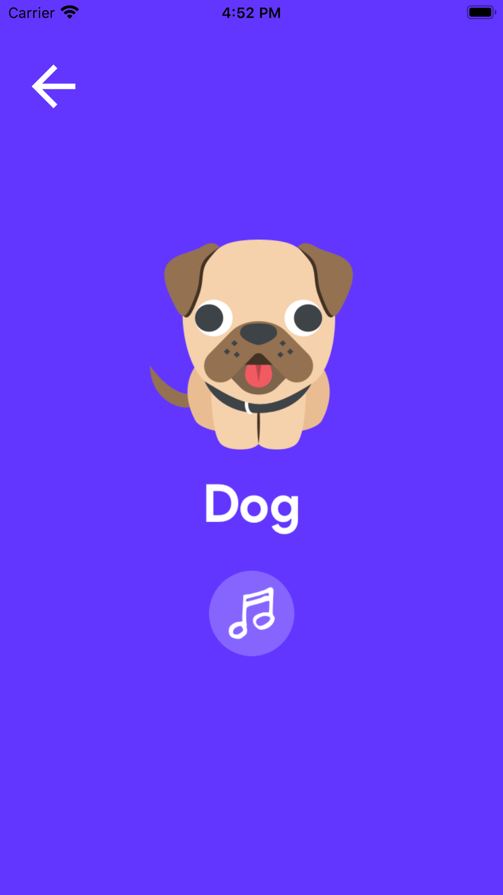 - Frog, Cat, Chicken, Cow, Dog, Sheep, Horse, Mouse, Pig, Duck, Lion, Bear, Snake, Chick, Elephant and Rabbit.