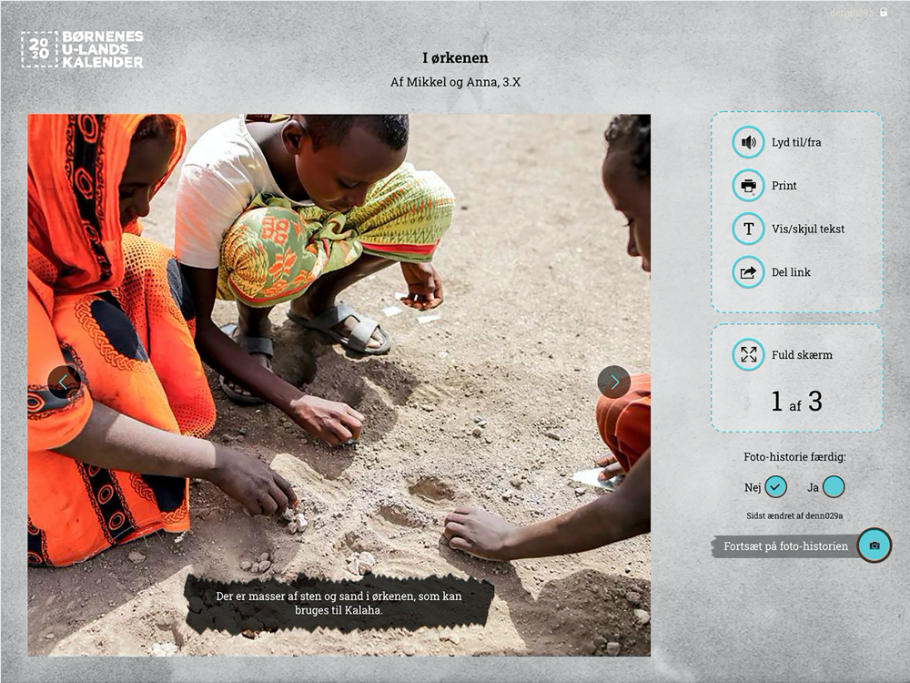 App’en og fotohistorierne er en del af det store undervisningsmateriale om Etiopien, som Danida udarbejder til de danske skoler i forbindelse med Børnenes U-landskalender 2020. Det består af elevbogen ’Ørkenpigen’ af Sandra Schwartz, en lærervejledning, et website med mange opgaver, aktiviteter og materialer til en hel række f*g, et værktøj til selv at lave en digital lågekalender med tilhørende kommunikationsforløb samt denne iPad-app. Hele materialet kan ses og bruges på 2020.u-landskalender.dk.