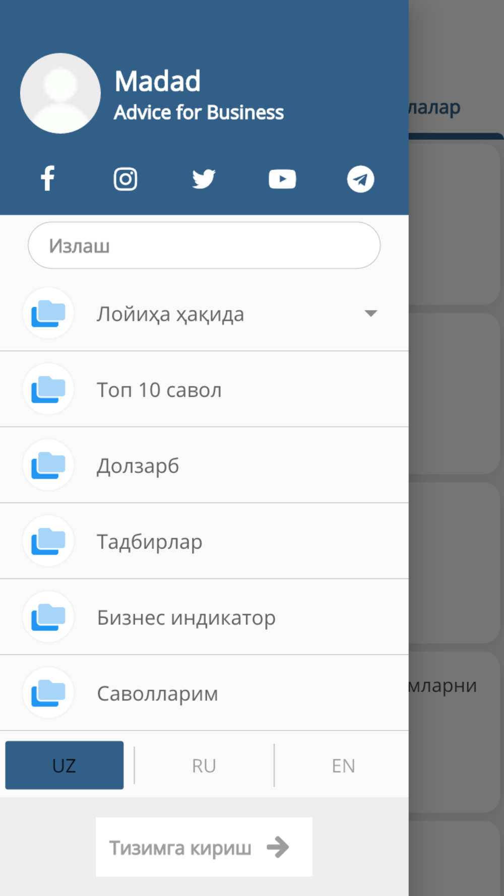 This mobile application is free of charge and purposed to legal aid for business environment in Uzbekistan.