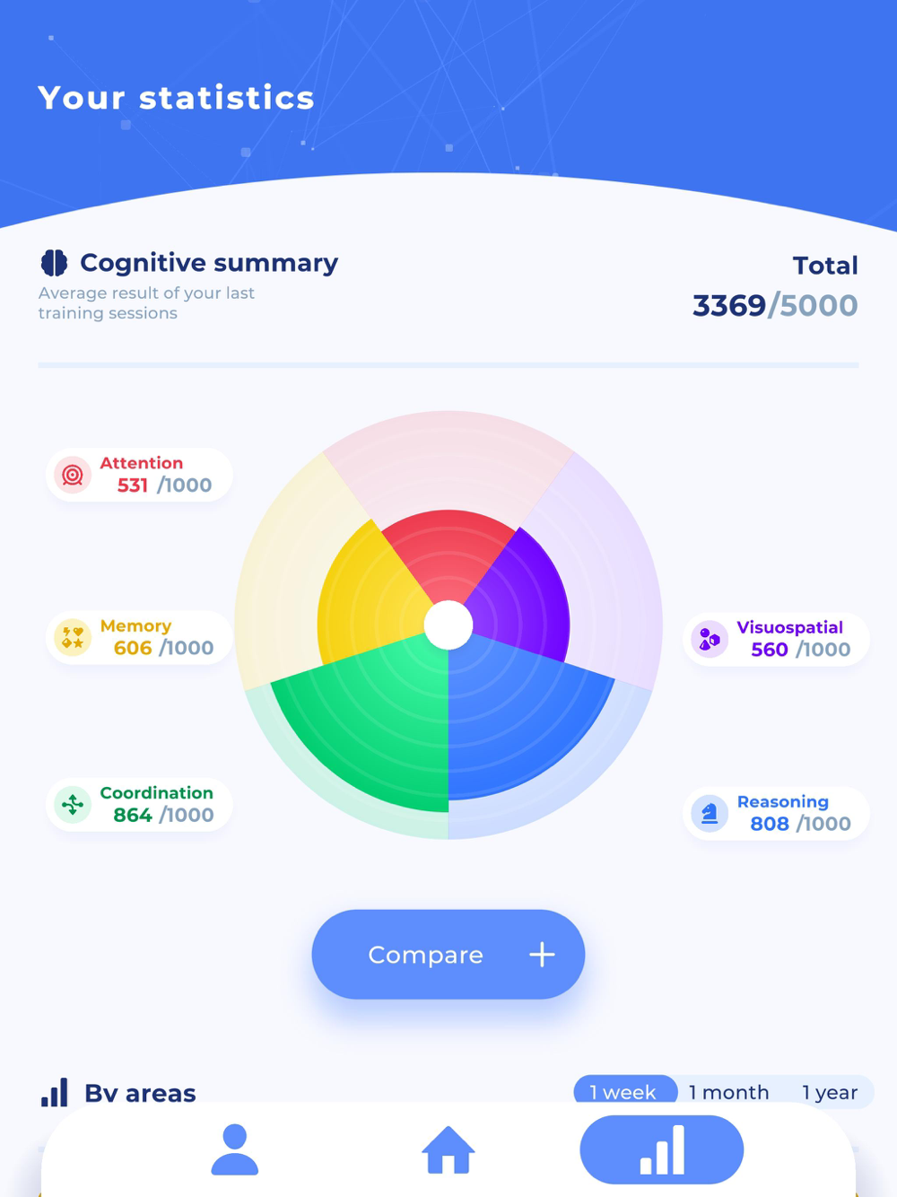 Focus - Train your brain has a statistics section where you can see your cognitive evolution during the last week, month or year. In addition, the app offers you a cognitive summary in which the average scores of the results of your daily workouts are shown.