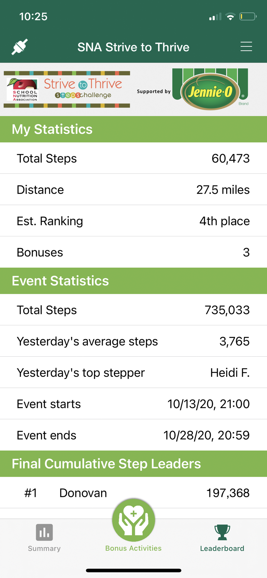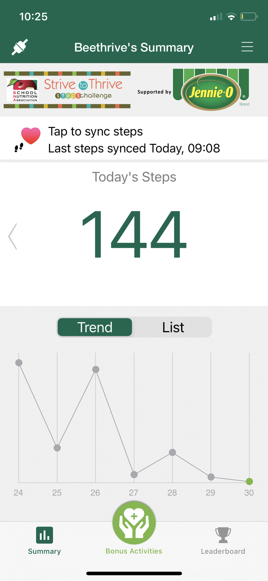 App supporting the School Nutrition Association's Strive to Thrive Wellness Challenge. Participate in some friendly competition with your peers and join in the fun activities. Staying active has proven beneficial for both physical and mental health, so join us in healthy activities for your body, mind and spirit - let's get moving together and thrive! The app supports step data from Fitbit, Garmin, and, via our integration with the Apple Health App, step data from Apple Watch and the step tracker integrated into your iPhone.