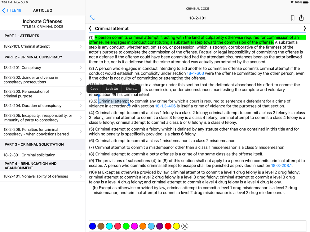 • Highlight any portion of statutory text for easier reference, to make studying easier, or to visually group related topical material, just like you can do in the dead-tree "Blue Book".